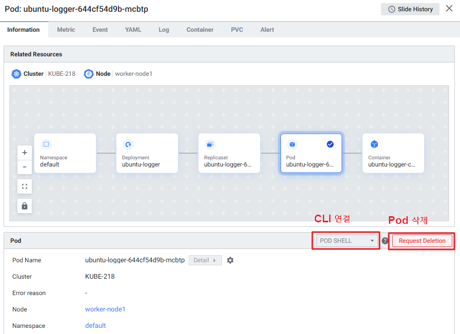 Pod Detail 화면에서 POD CLI 및 삭제 요청 기능 사용을 위해 역할 권한 및 k8s-agent 권한이 필요합니다.