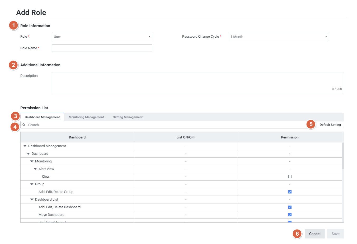 역할 추가/편집Setting > Permission > Role Permission > Add/Edit Role