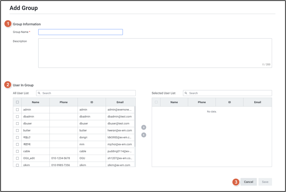 [Add Group] 버튼을 클릭하여 그룹 정보와 소속 사용자를 등록합니다.
