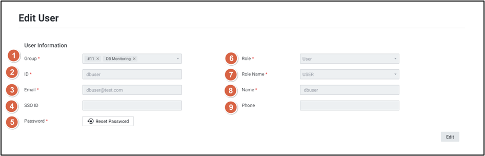 User List에서 ID를 클릭하면 사용자 정보 편집 화면이 열리며, [Edit] 버튼을 클릭하여 수정할 수 있습니다. Reset Password 버튼으로 비밀번호 초기화도 가능합니다.