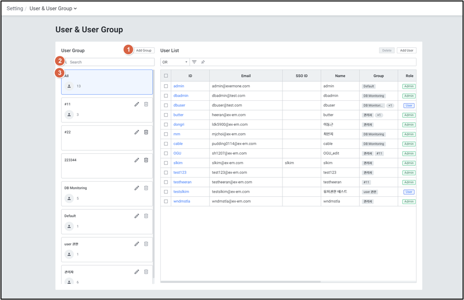 - 계정 관리(User & User Group, Permission) 메뉴는 Admin 역할을 가진 사용자만 접근 가능합니다.