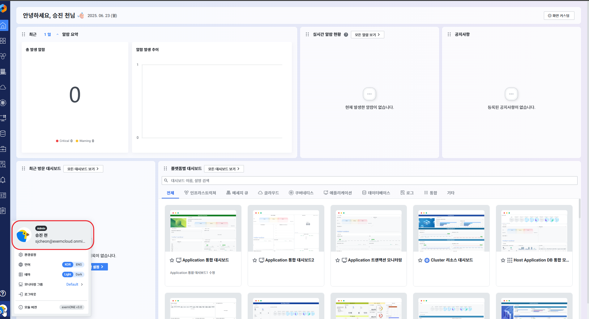 사용자 역할 권한별 Session Timeout 기능을 적용하여, 설정된 시간 초과 시 자동 로그아웃됩니다.