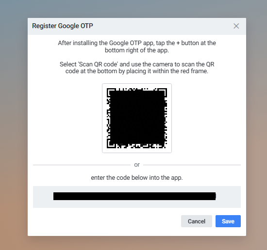 - Google OTP 등록 팝업 출현 → QR코드 또는 접속 코드로 등록