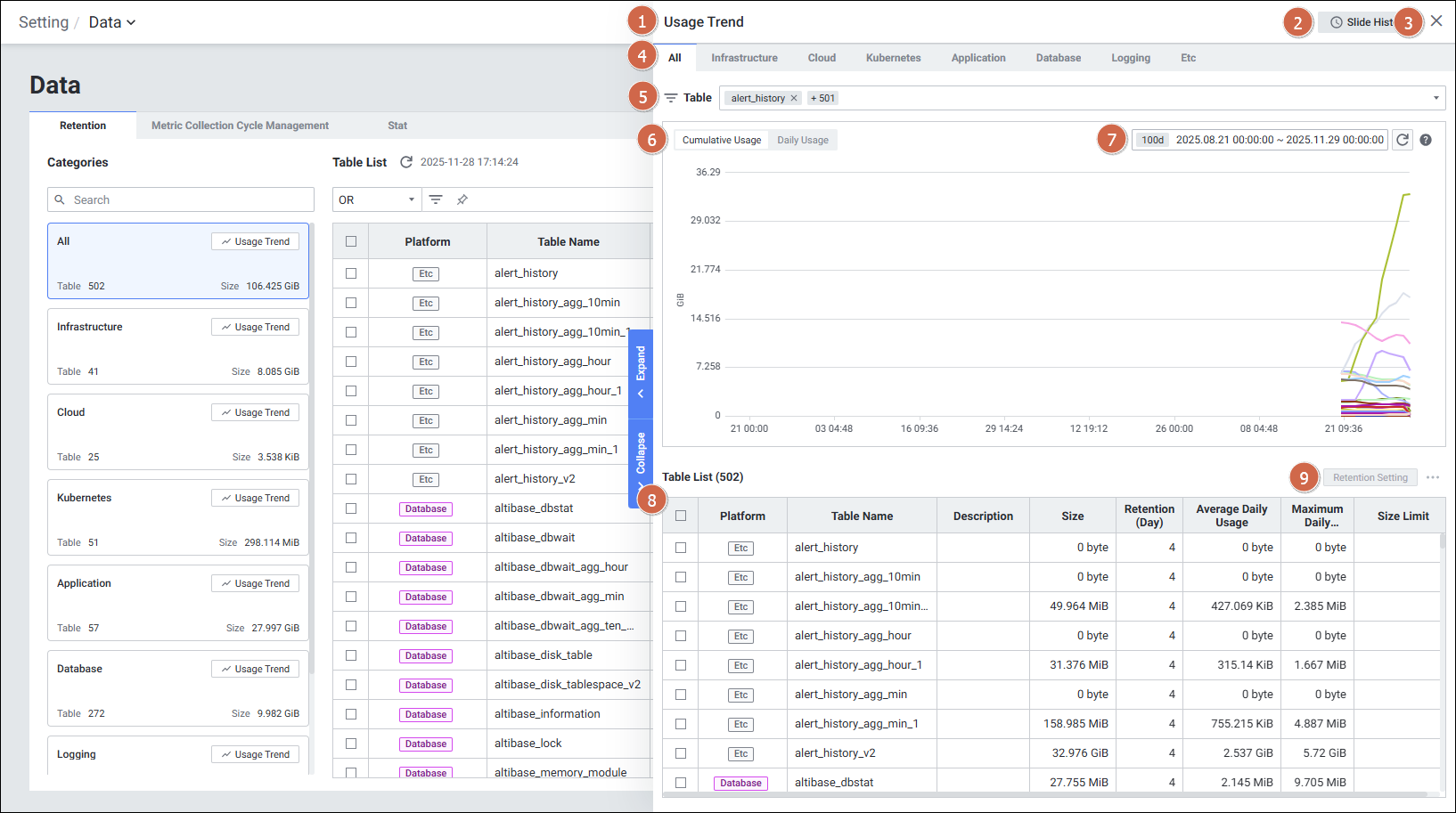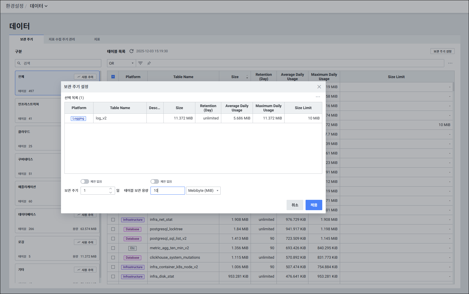 플랫폼별 데이터 테이블 목록을 확인하고, 보관 주기 및 테이블 보관 용량을 설정하여 수집 서버 디스크 용량을 관리합니다.