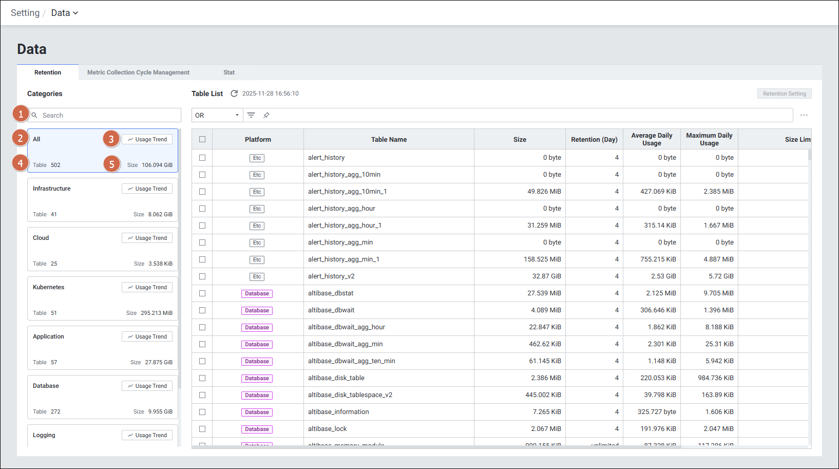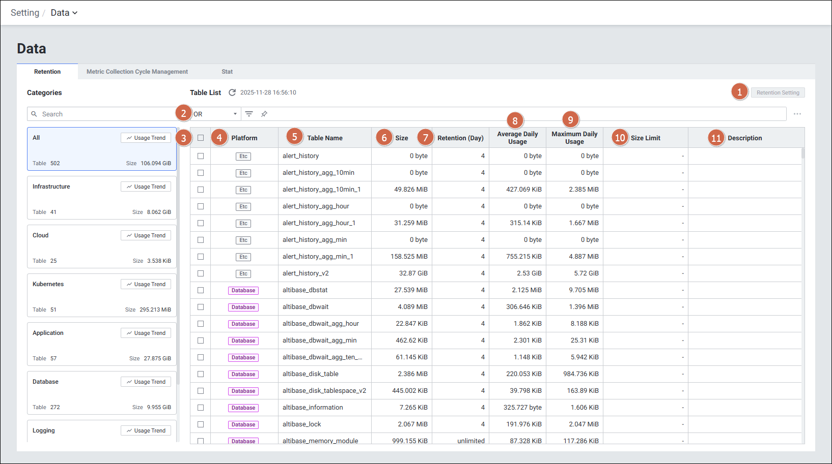 | Retention Setting (보관 주기 변경) | 위 메뉴에서 테이블 선택 > [Retention Setting] 클릭 |