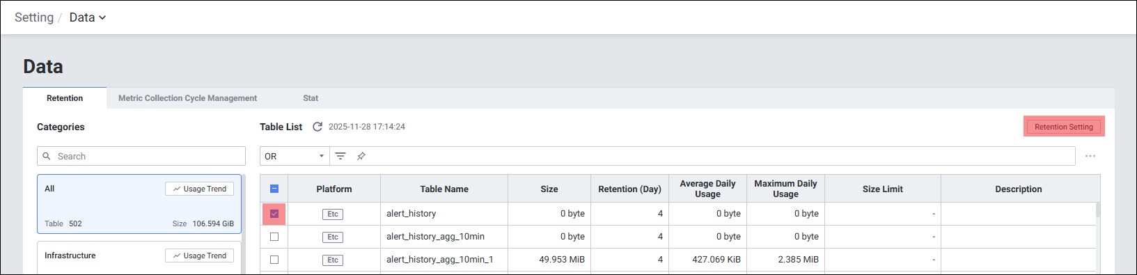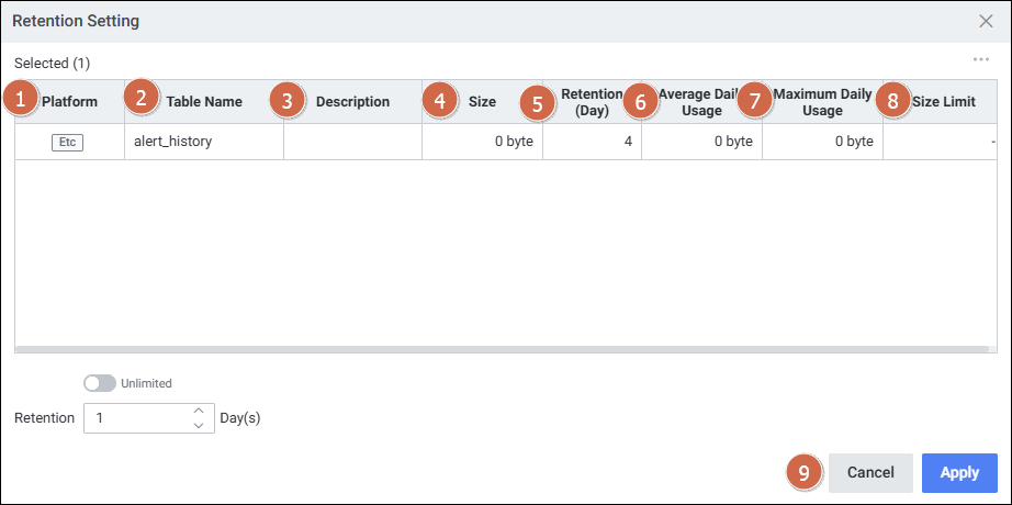 | 1 | Retention Setting | 선택한 테이블의 보관 주기를 설정합니다. |