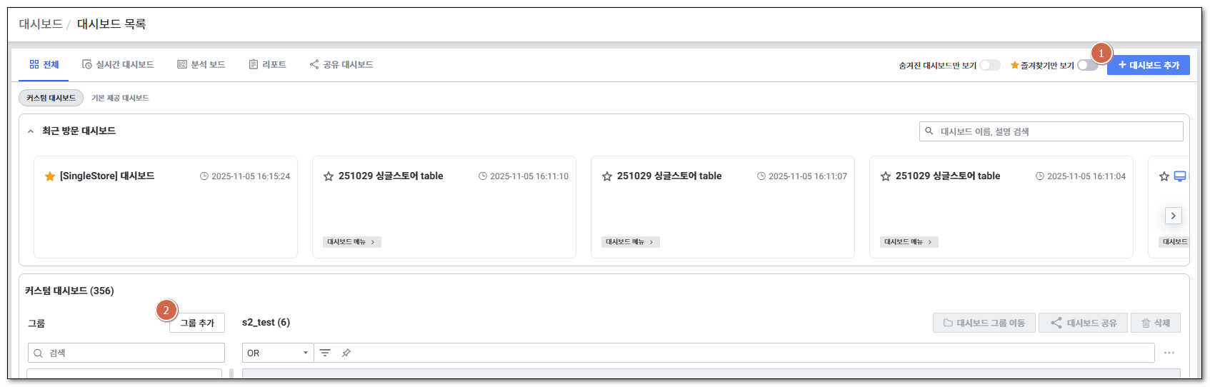 대시보드 목록은 사용자가 생성한 대시보드를 그룹별로 관리하는 화면입니다.