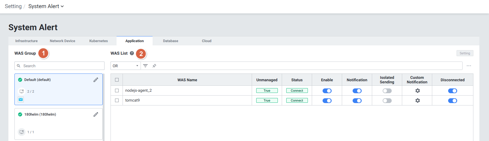 WAS 그룹 및 개별 WAS 단위로 알람을 설정할 수 있습니다.