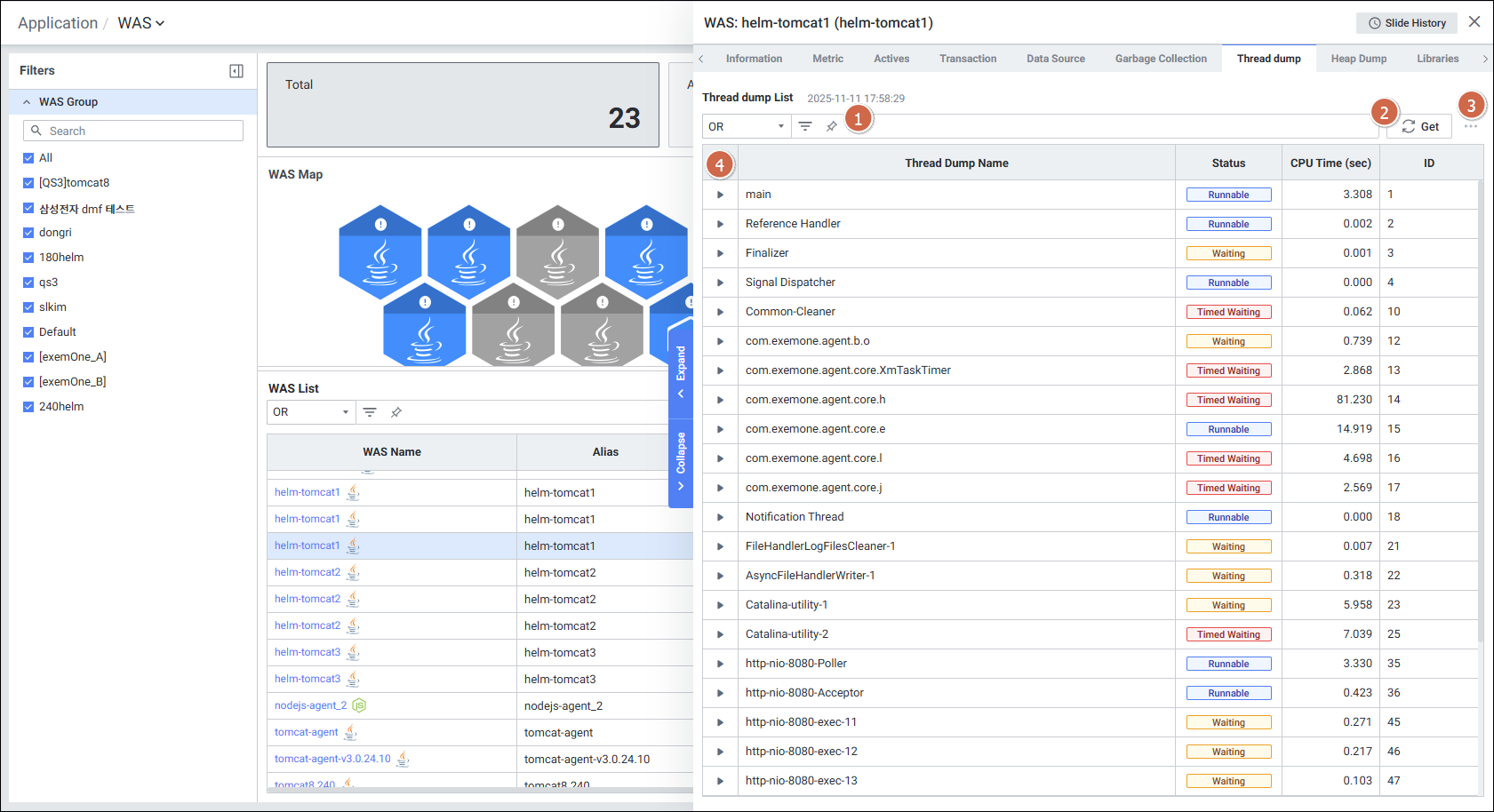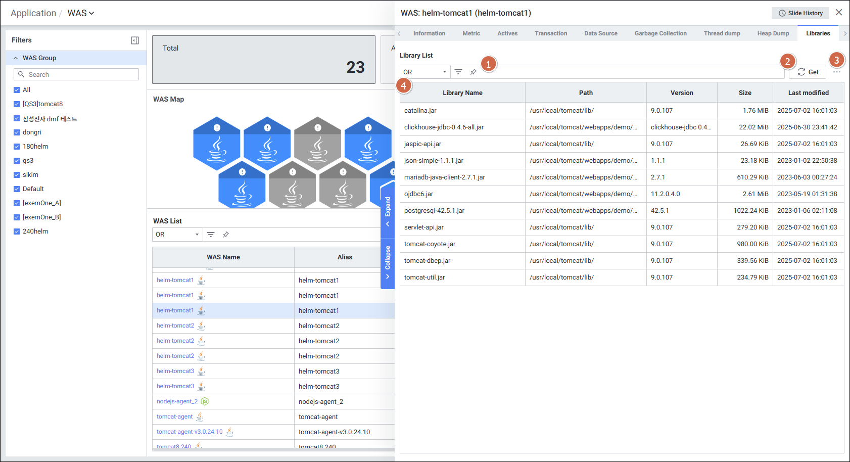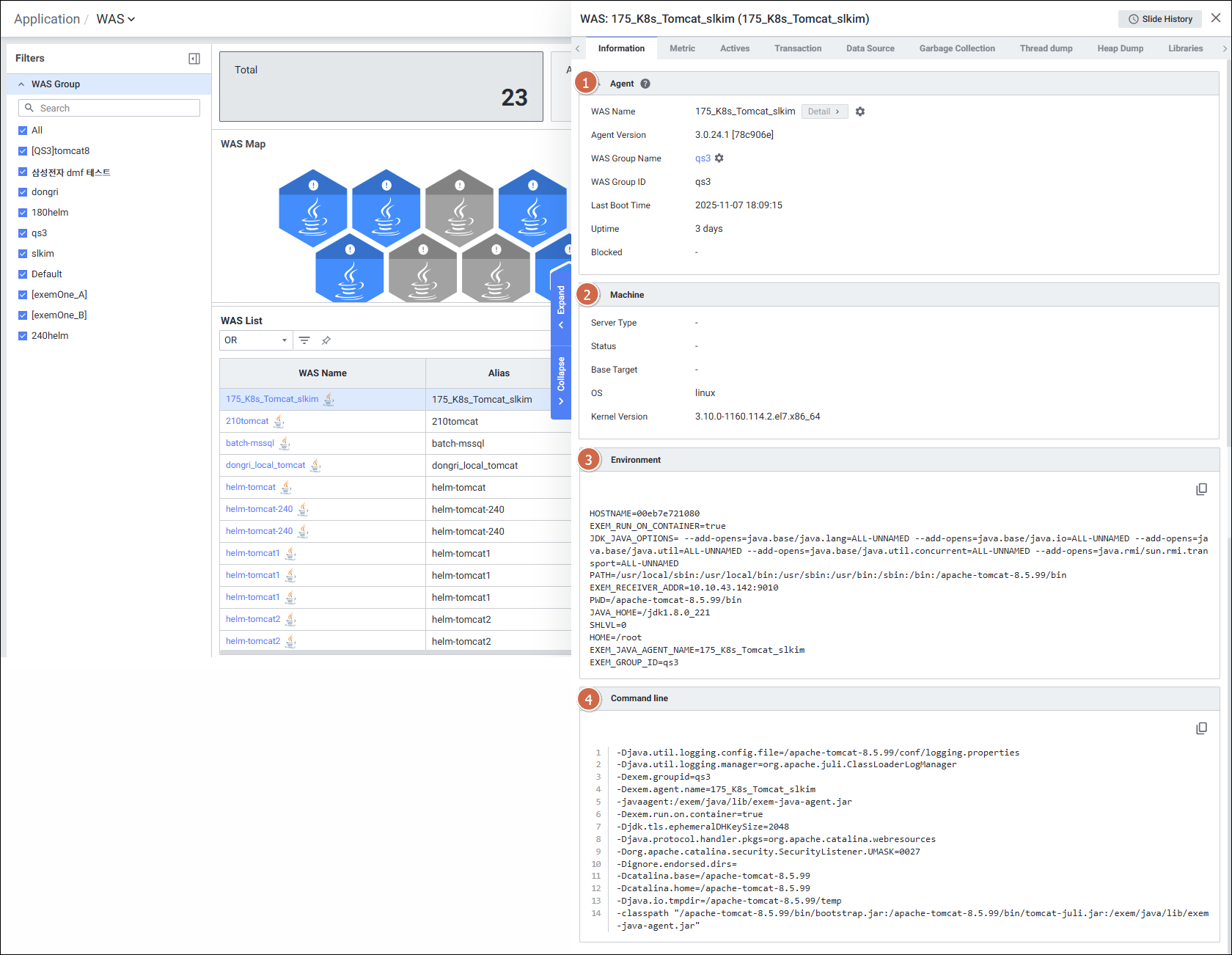 WAS Map이나 WAS List에서 특정 WAS를 클릭하면 Detail Slide가 열립니다. 총 12개 탭으로 구성되어 있습니다.