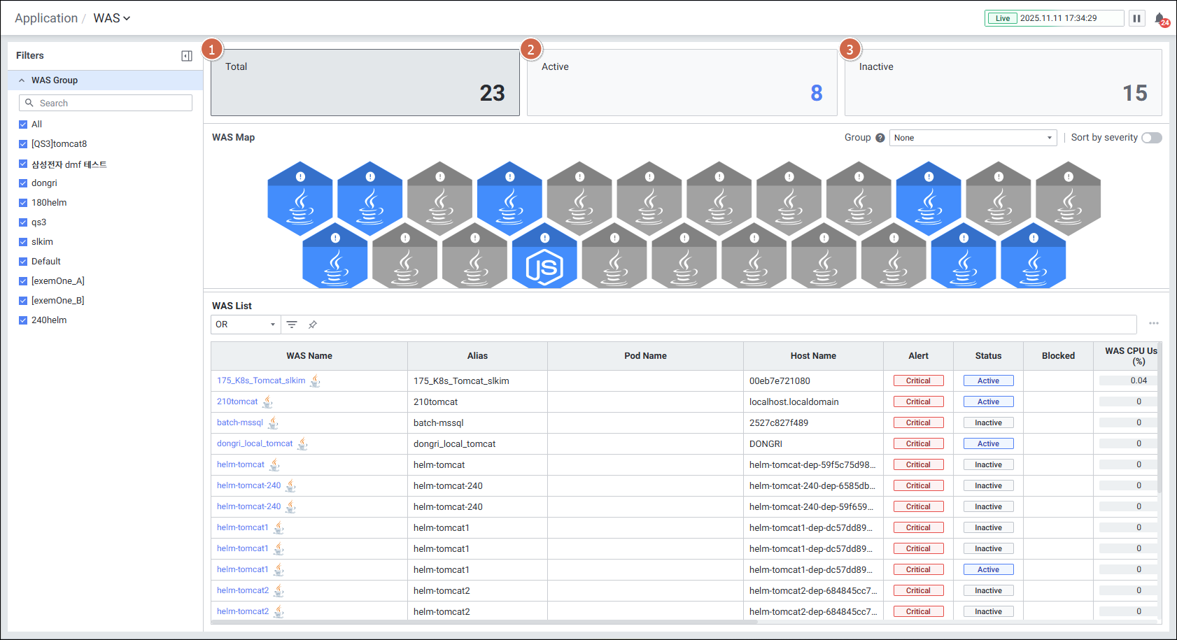 • 각 상태를 클릭하면 WAS Map과 WAS List에서 해당 상태의 WAS만 필터링하여 표시합니다.