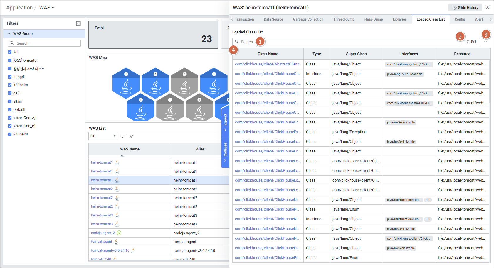 WAS에 로딩된 클래스 목록을 확인하는 화면입니다.