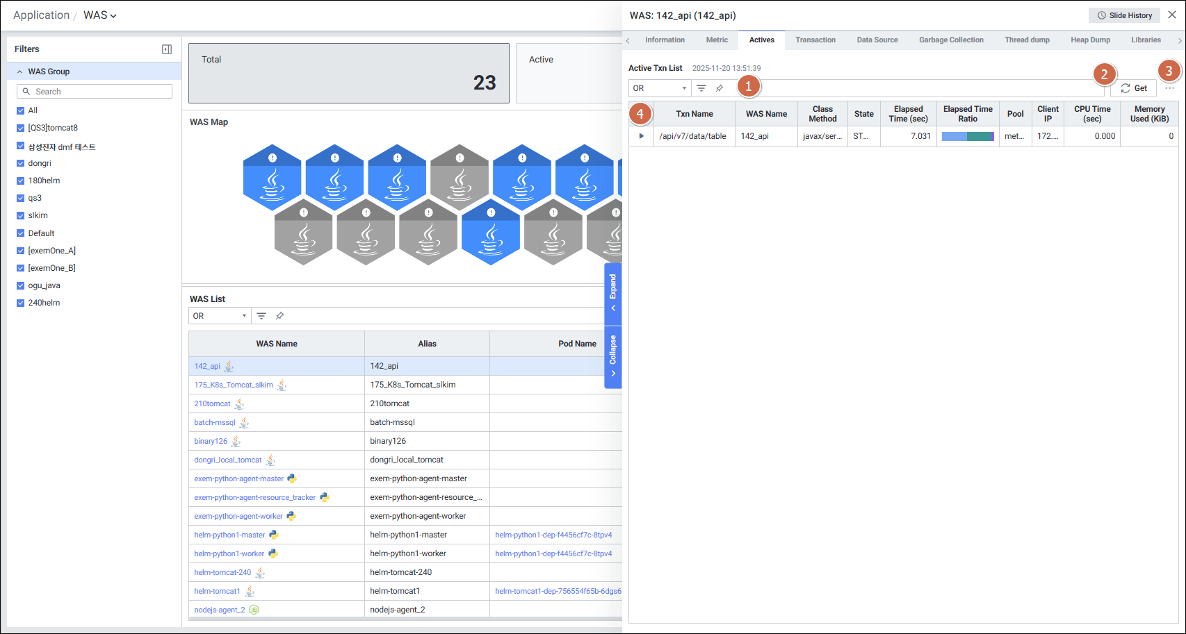 액티브 트랜잭션Txn Name, Class Method, State, Elapse Time, Client IP, CPU Time, Memory Used, Pool