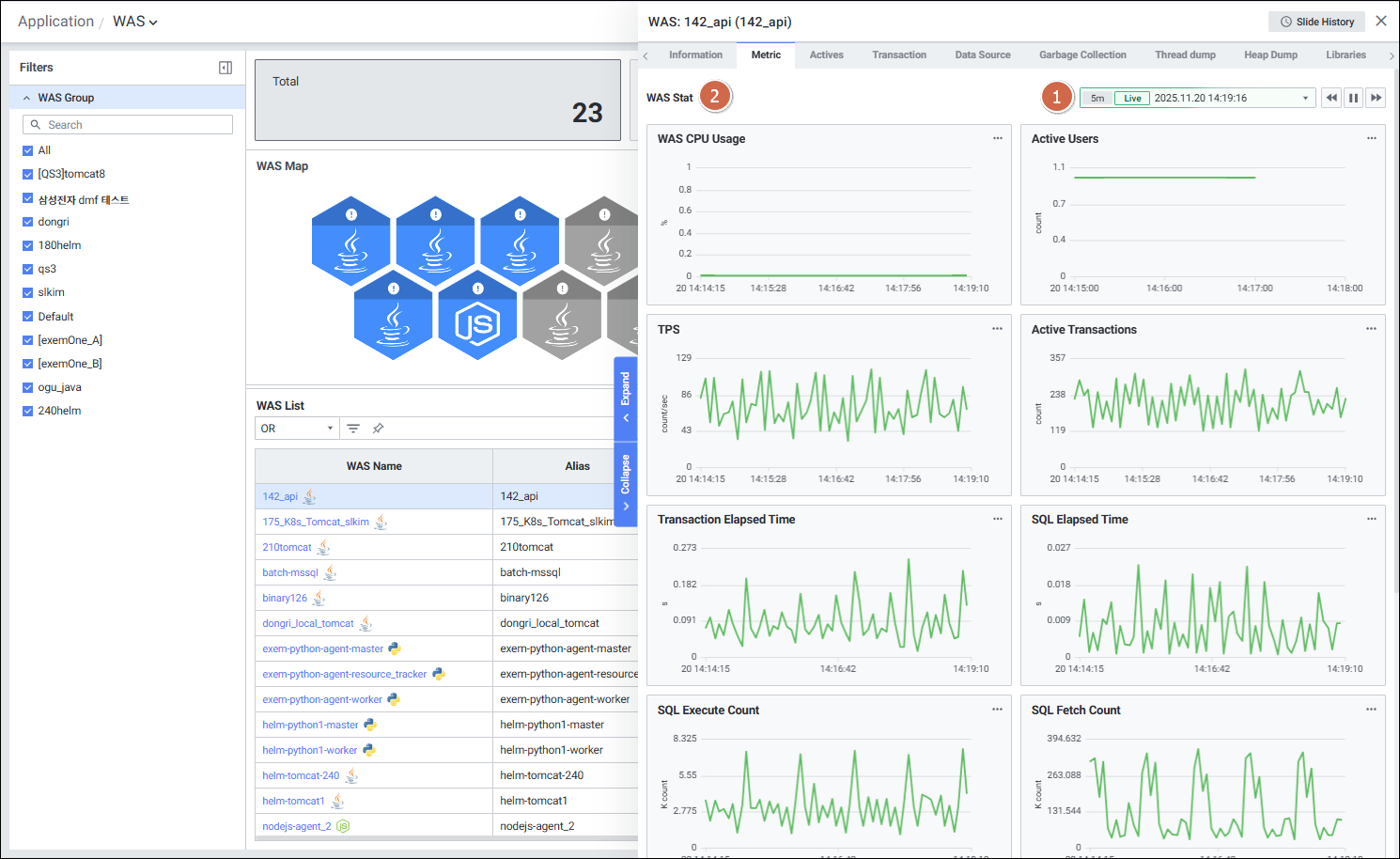 4. 실시간 vs 이력 데이터: WAS 메인 화면(WAS Status, WAS Map, WAS List)은 실시간 데이터만 조회 가능하며, Detail Slide의 Metric은 최근 5분, Transaction은 최근 10분 데이터를 기본으로 표시합니다.