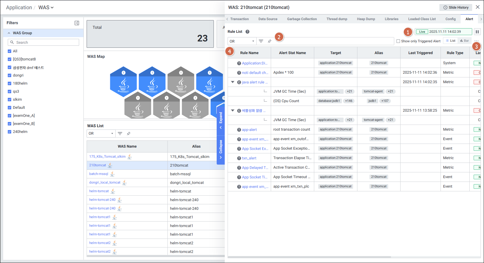 해당 WAS에 설정된 알람 규칙과 발생 이력을 확인하는 화면입니다.
