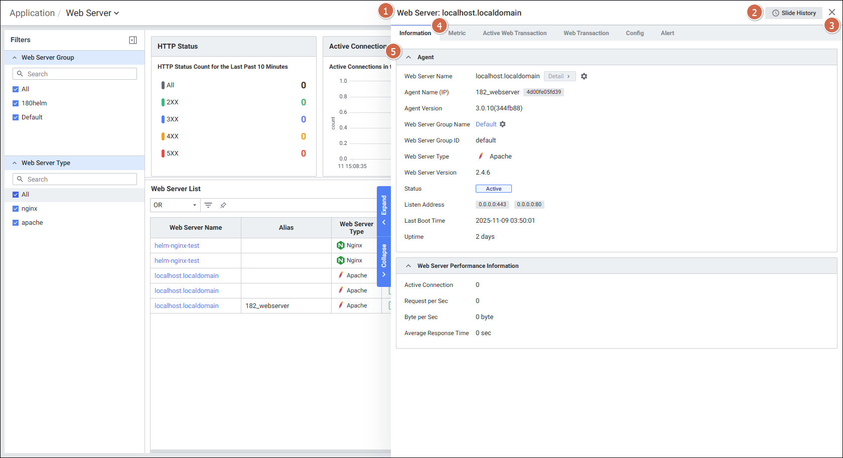 Web Server 목록에서 항목을 클릭하면 상세 슬라이드가 열립니다. 6개의 탭으로 구성됩니다.