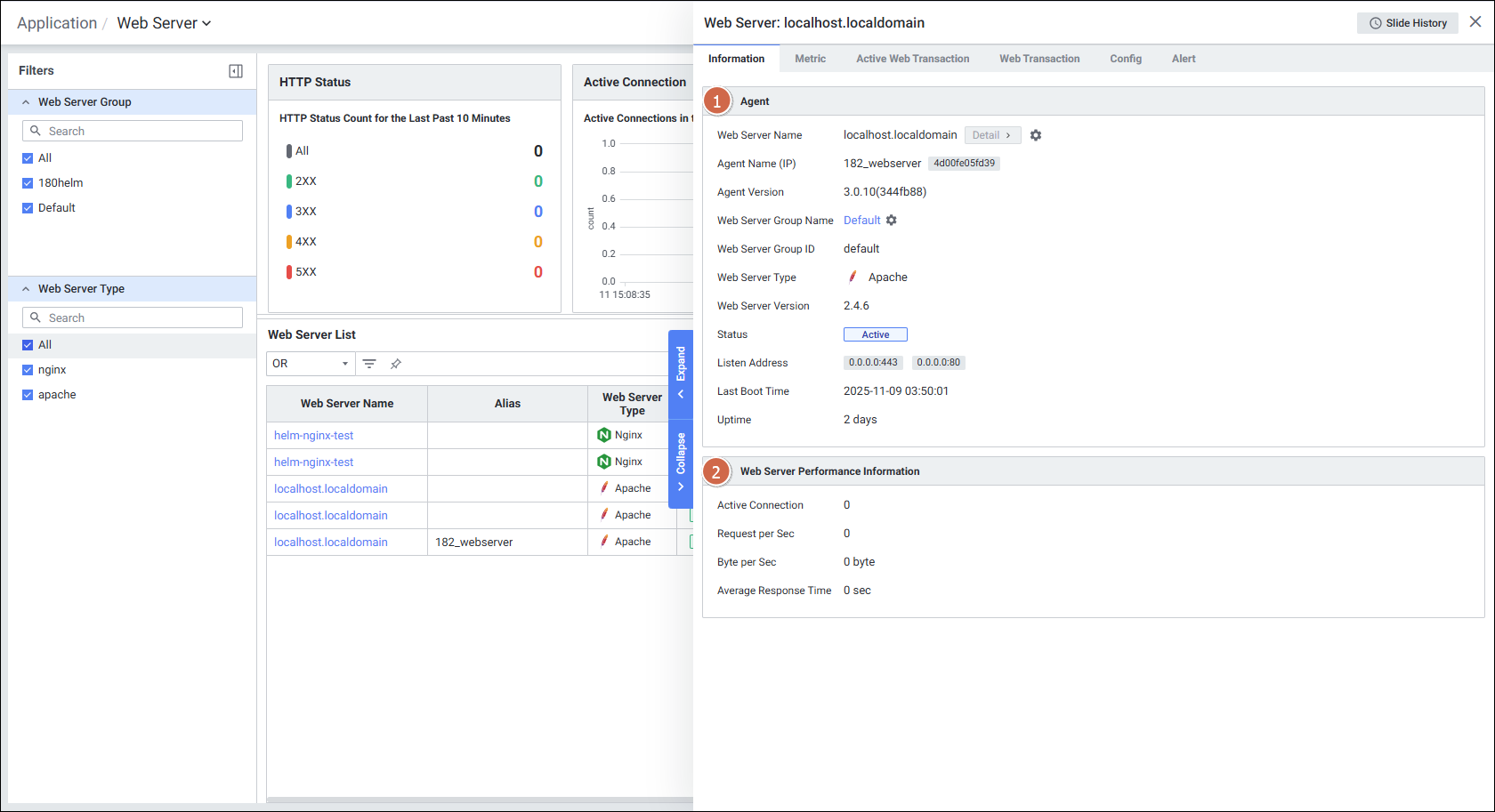 | 에이전트 정보 | Agent Name, Version, Web Server Type/Version, Status, Listen Address, Uptime |