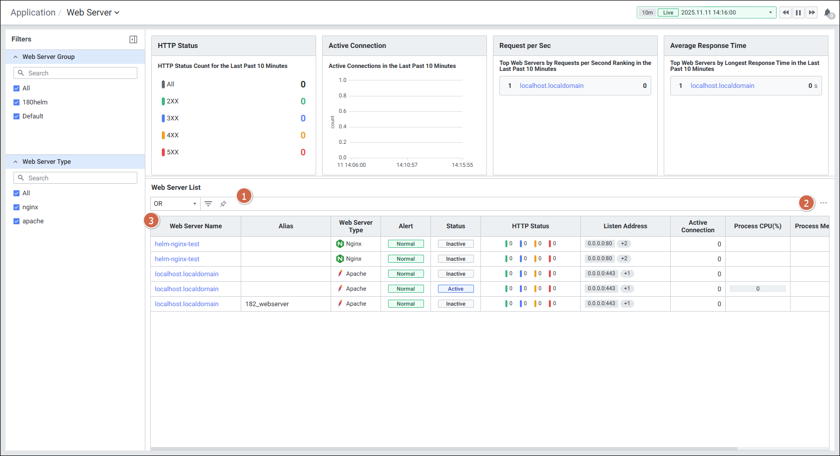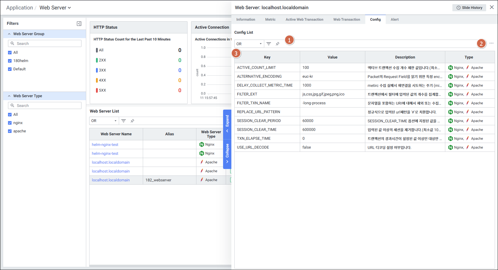 | 2 | Filters | Web Server 화면의 필터 항목 선택 |