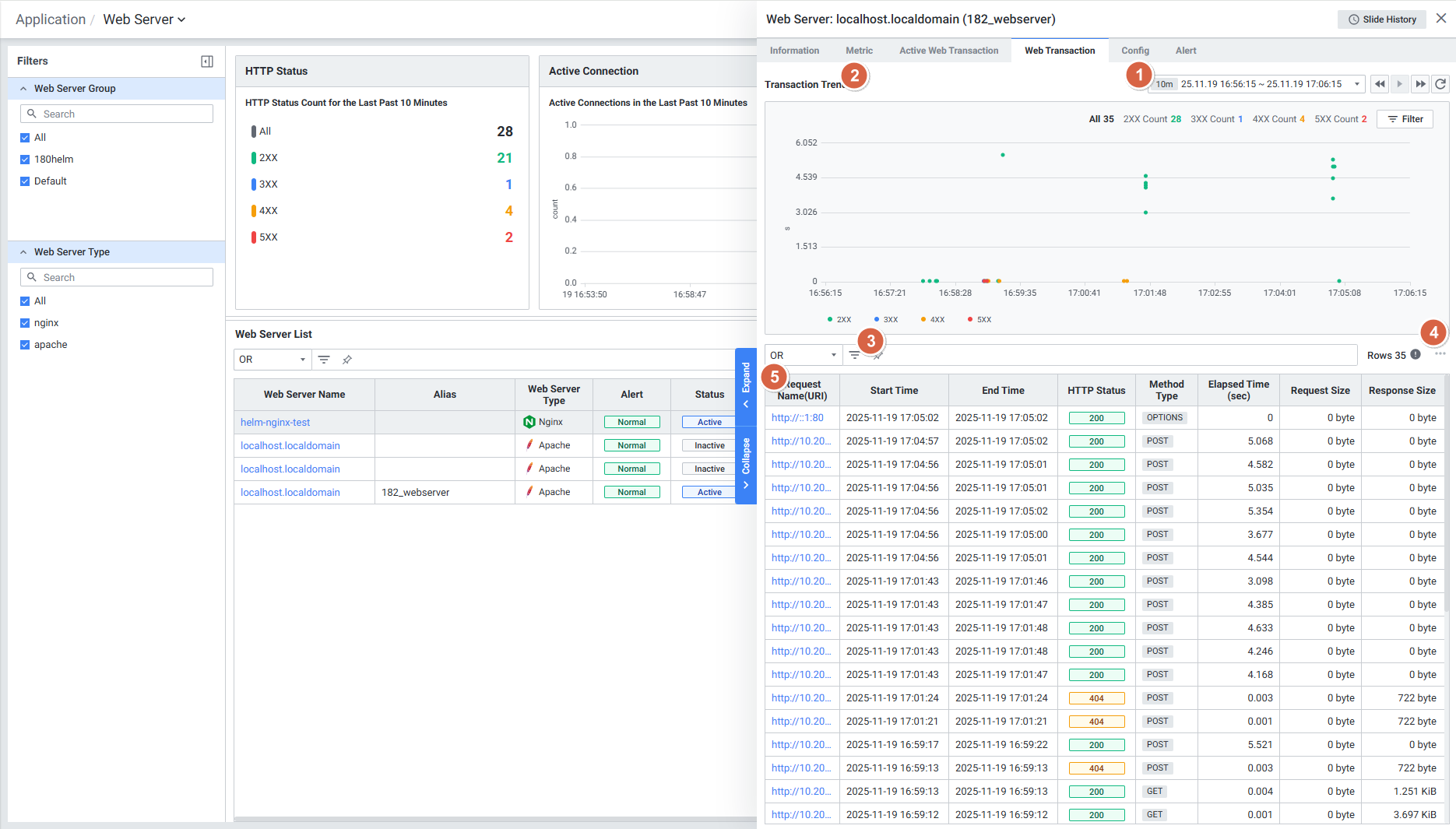 Web Server의 시계열 성능 지표를 차트로 보여줍니다. (Default: 최근 5분)
