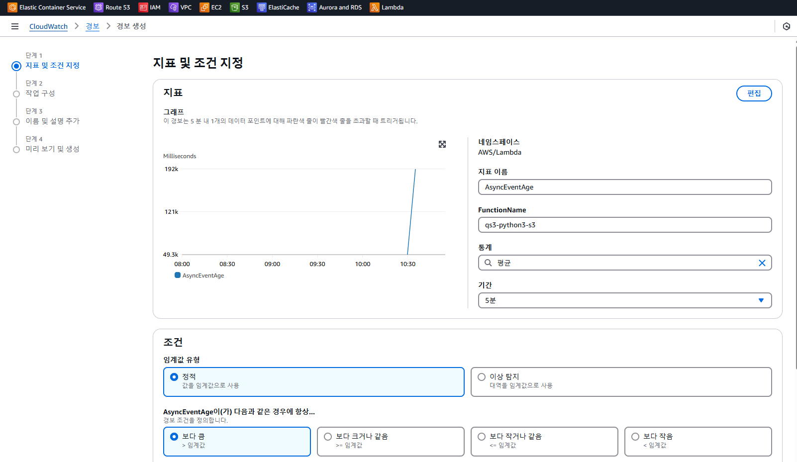 모니터링하고자 하는 지표를 선택하고 경보 조건을 지정하여 경보를 생성합니다.