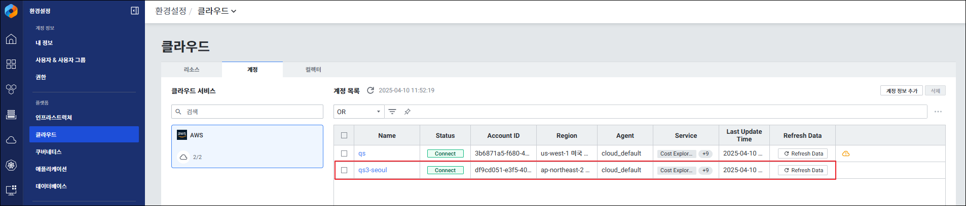 [Step 2] 계정 등록 후 "Refresh Data"를 클릭하여 등록된 계정의 서비스를 불러옵니다.