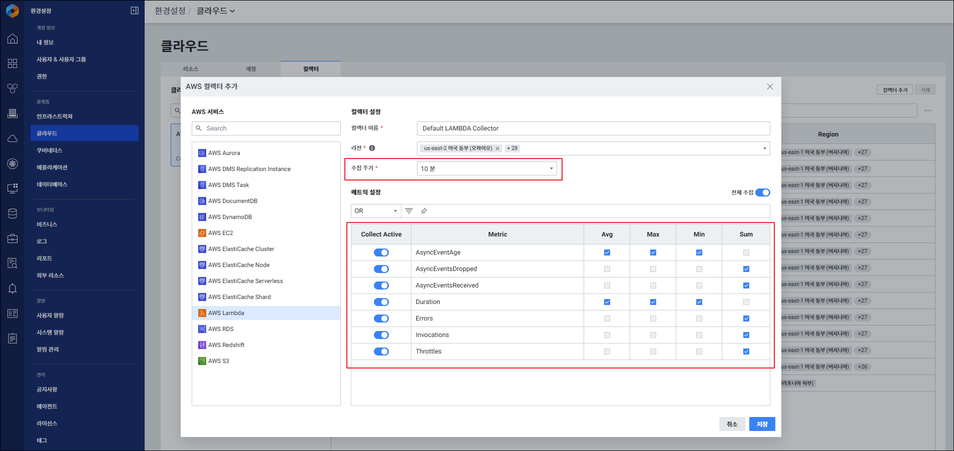 [Step 4] Setting > Cloud > Collector 탭에서 Default LAMBDA Collector의 수집 주기 및 지표를 확인하여 필요 시 변경합니다.