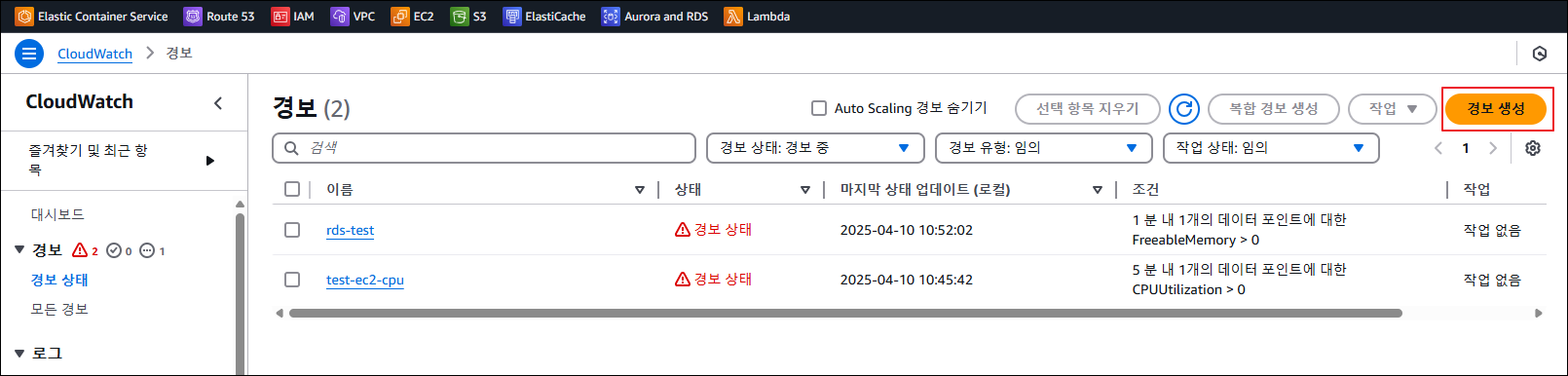 CloudWatch > 경보 상태 > 경보 생성을 선택하여 경보를 등록합니다.