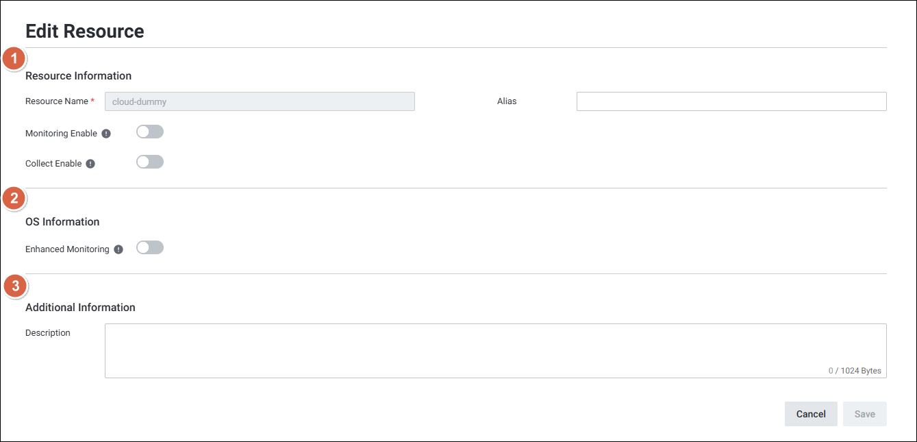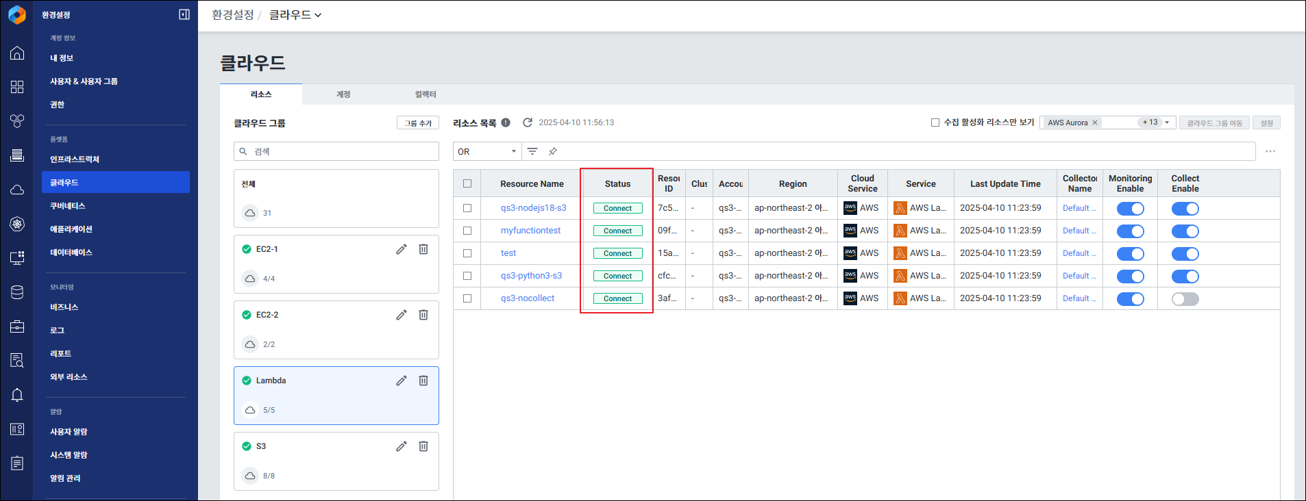 | 1 | Resource Information | - 모니터링 활성화: 클라우드 모니터링 활성화 여부 - 수집 활성화: 클라우드 메트릭, 로그, AWS 경보 등 데이터 수집 여부 |