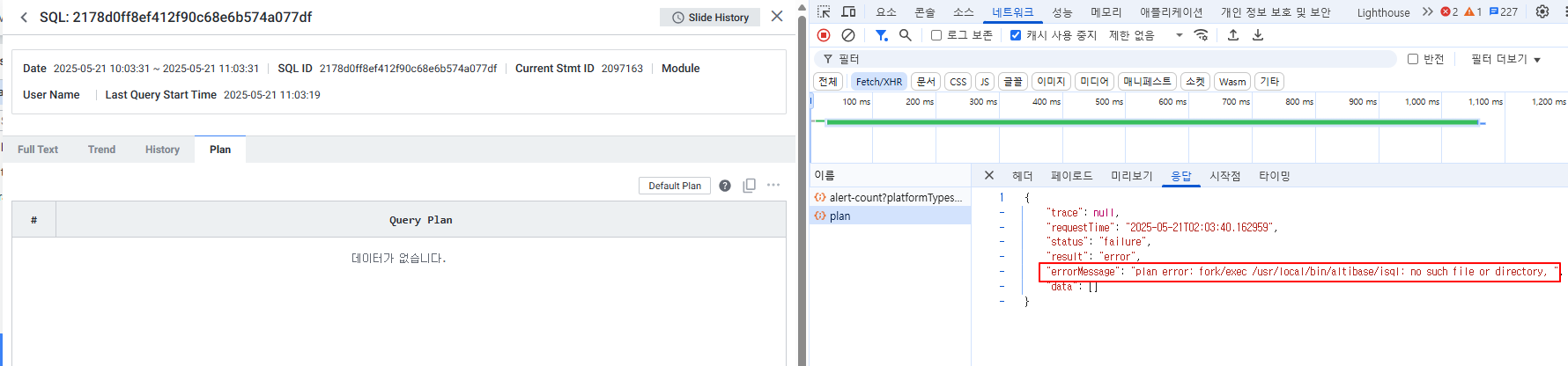 바이너리 환경에서 Altibase SQL Plan 조회 시 'no such file or directory' 로그가 확인되며 실패하는 경우: