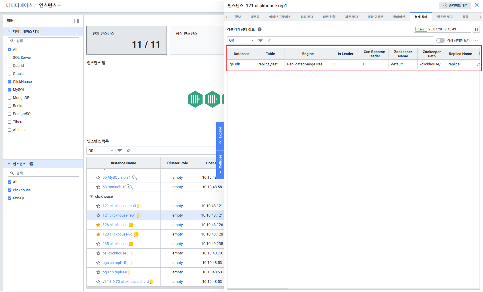 ClickHouse 인스턴스를 선택하면 13개 탭을 통해 상세 모니터링이 가능합니다.