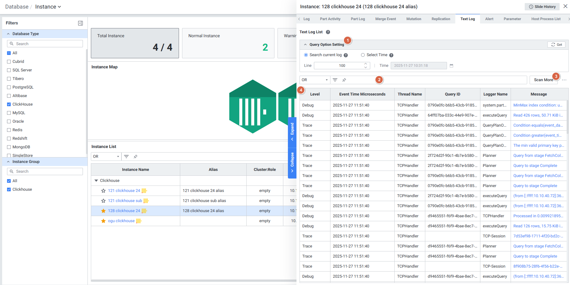 ClickHouse 내부 Text Log를 조회합니다. 현재 로그 조회 또는 특정 시간 선택 조회가 가능하며, Line 수를 지정하여 추가 조회할 수 있습니다.