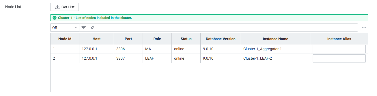 Get List 성공 시 {Cluster명} - List of nodes included in the cluster. 안내 문구가 출력되며, 각 노드에 대해 Instance Alias를 지정할 수 있습니다.