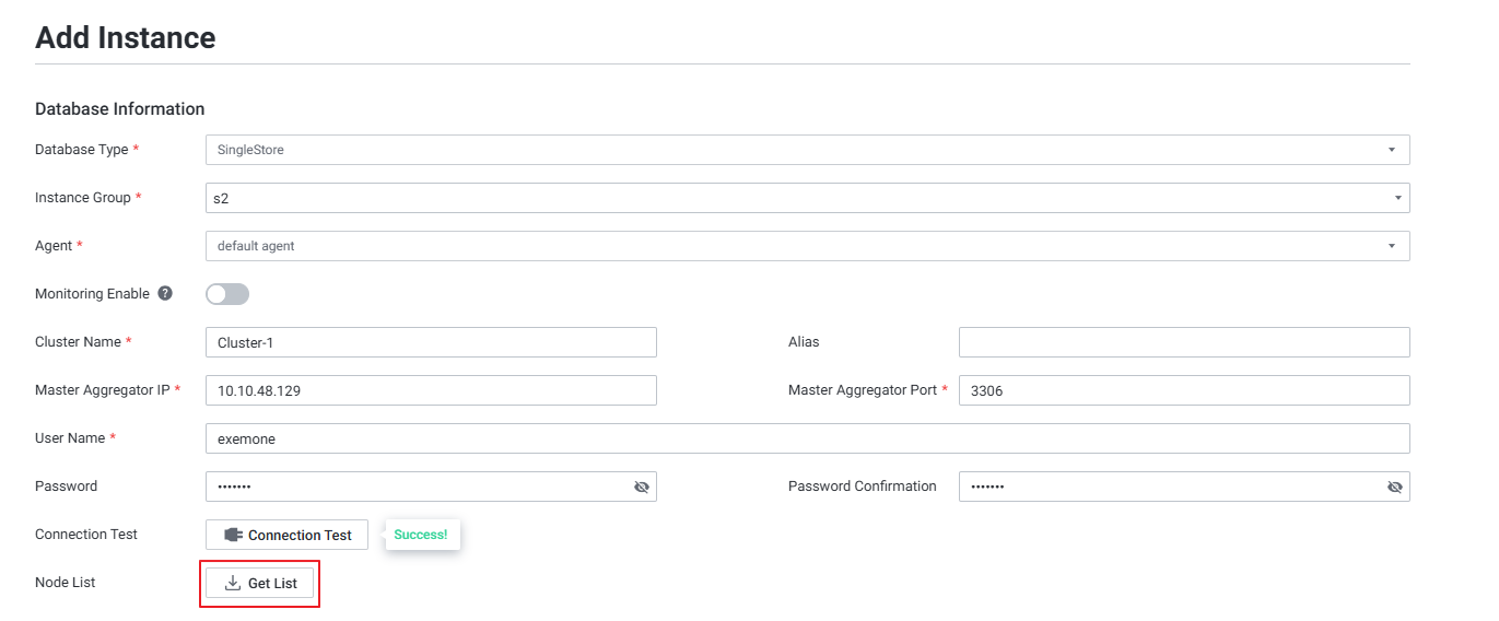 - SingleStore는 클러스터 기반 데이터베이스로, Master Aggregator 정보를 통해 전체 노드를 자동으로 검색하여 등록하는 방식입니다. 개별 노드를 수동으로 등록하는 것이 아닌 [Get List] 기능을 통한 일괄 등록이 필요합니다.