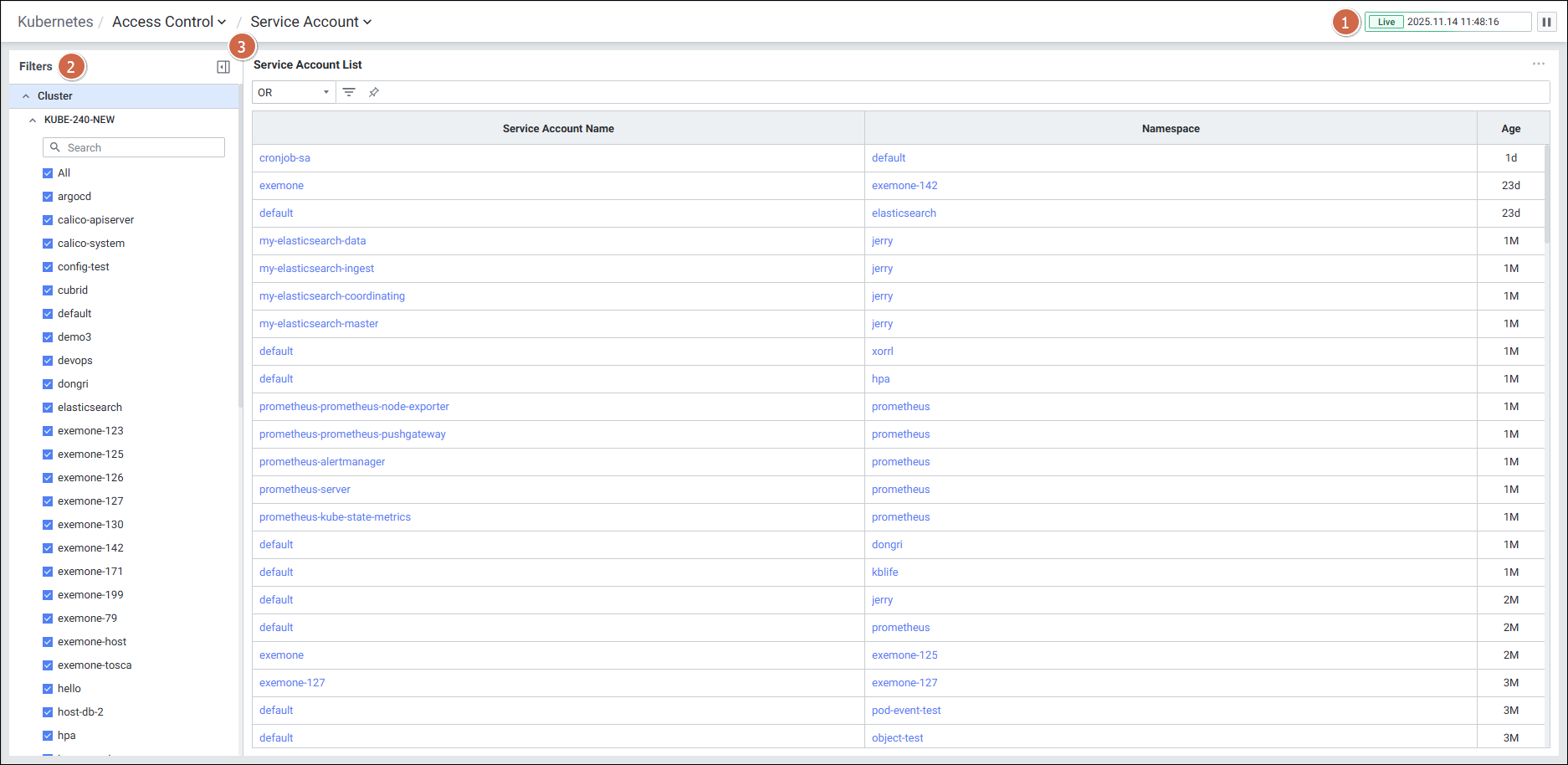 Access Control 관점의 Service Account 기본 모니터링 화면입니다.