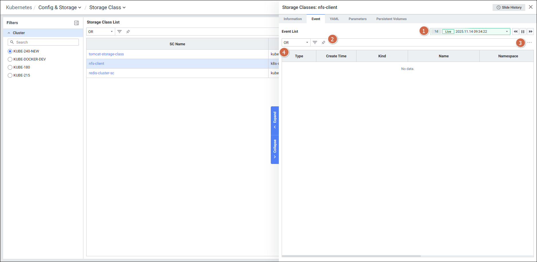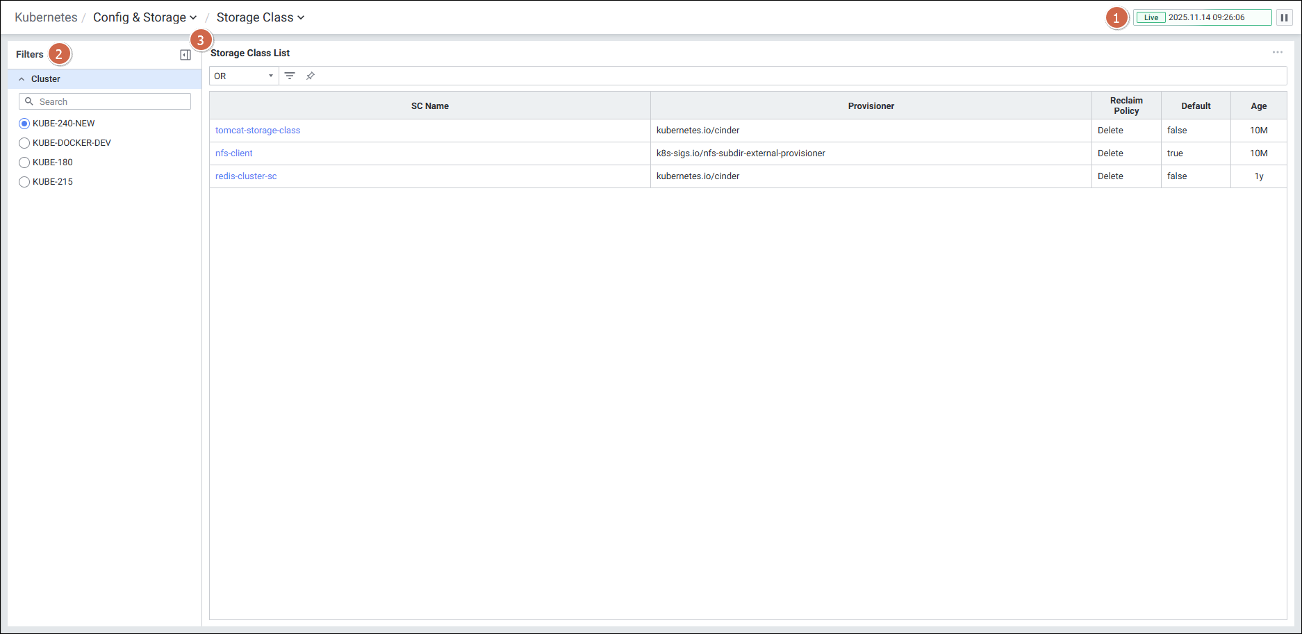 | 2 | Filters | Storage Class 화면의 필터 항목을 선택합니다. |