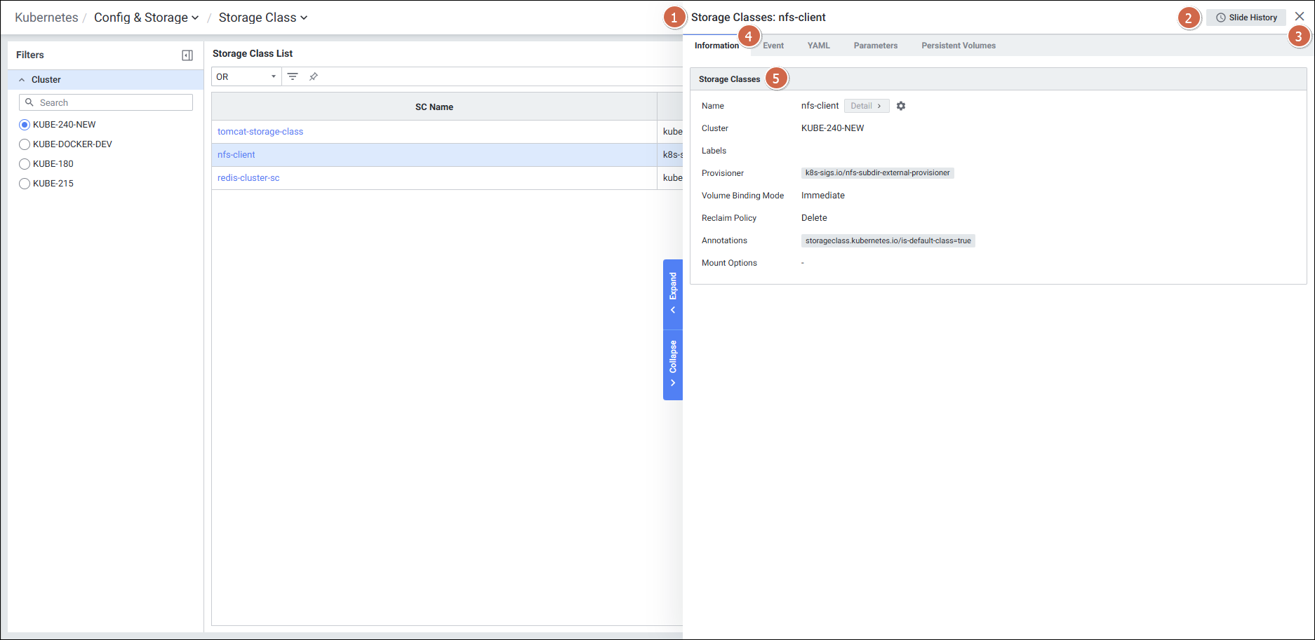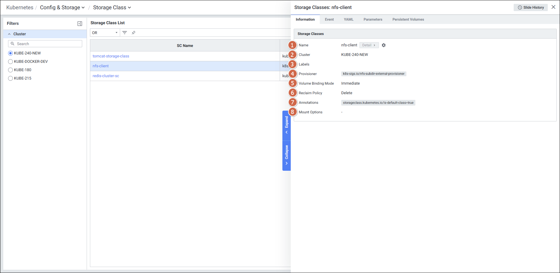 | 4 | Tab | 탭 클릭 시 해당 탭의 디테일 슬라이드 화면을 보여줍니다. - Information - Event - YAML - Parameters - Persistent Volumes |