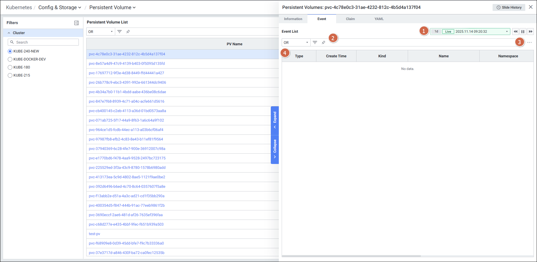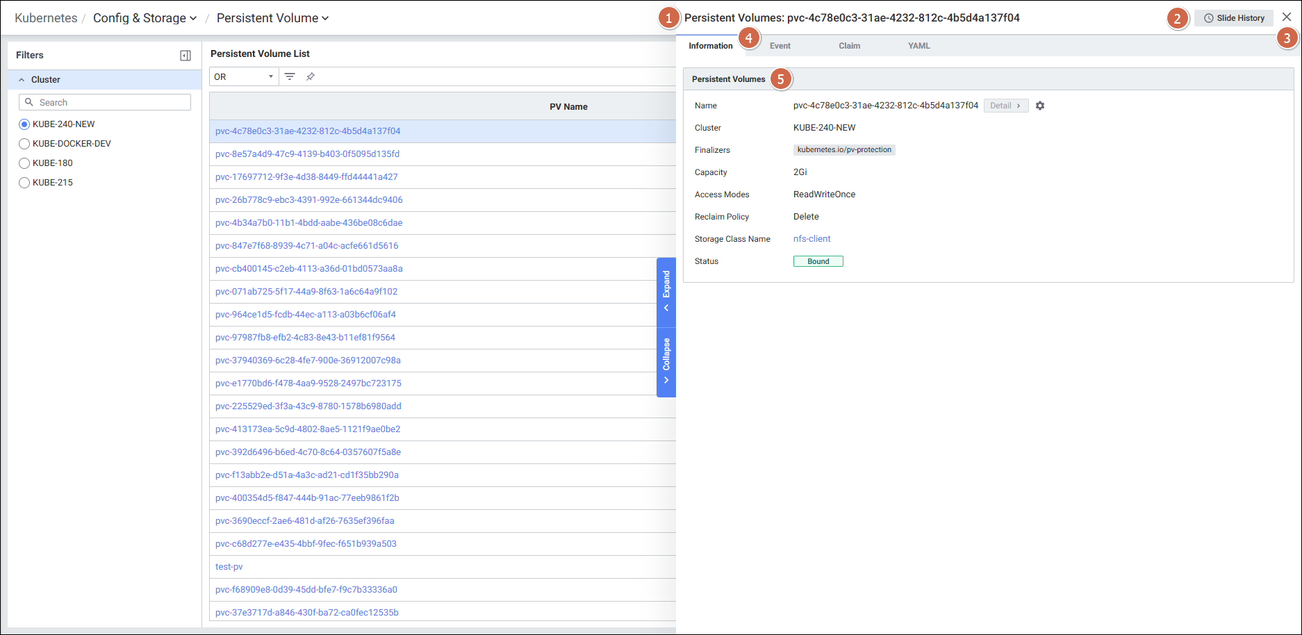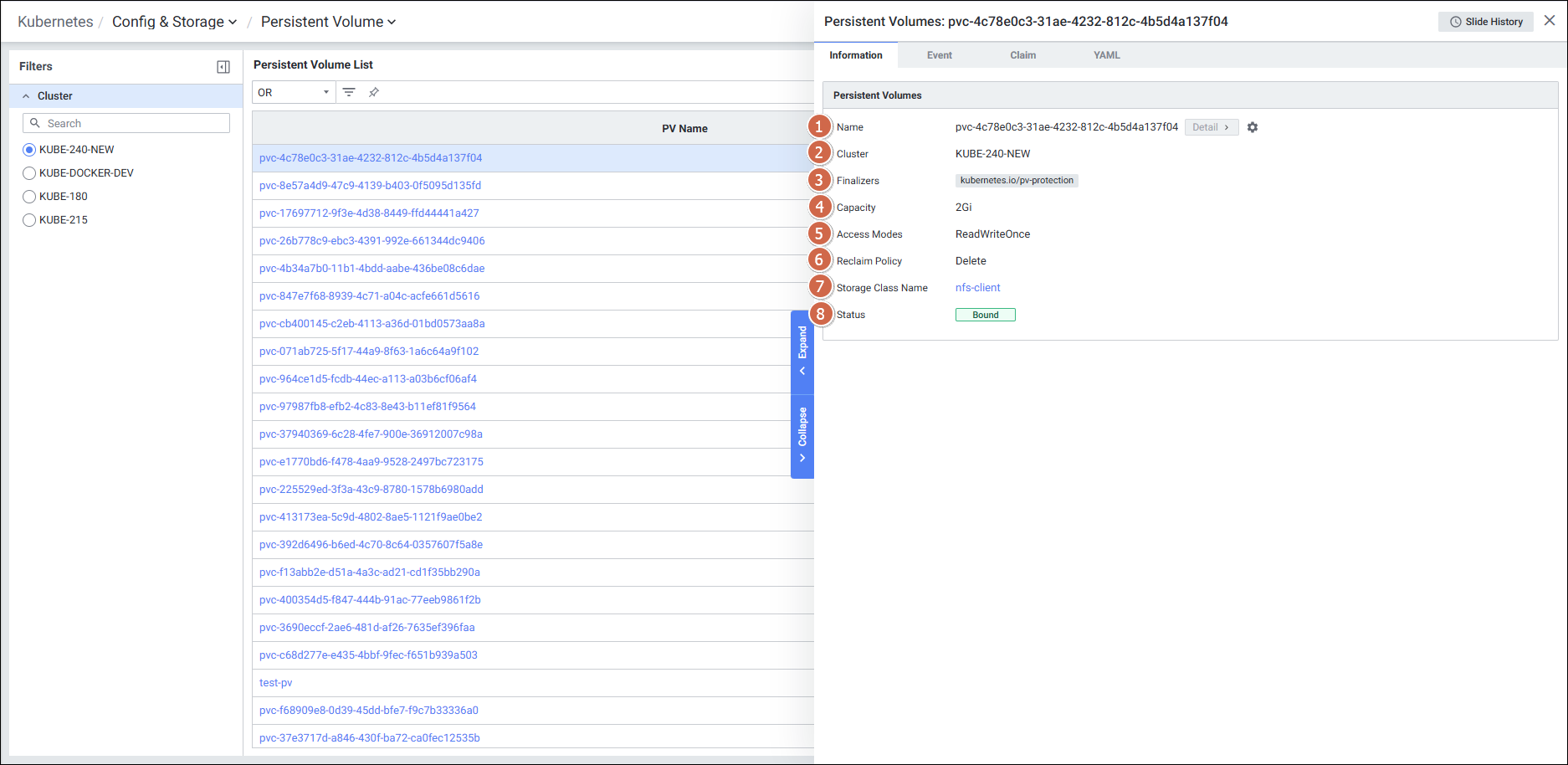 | 1 | PV Name | Persistent Volume의 이름 (클릭 시 PV Detail Slide 오픈) |