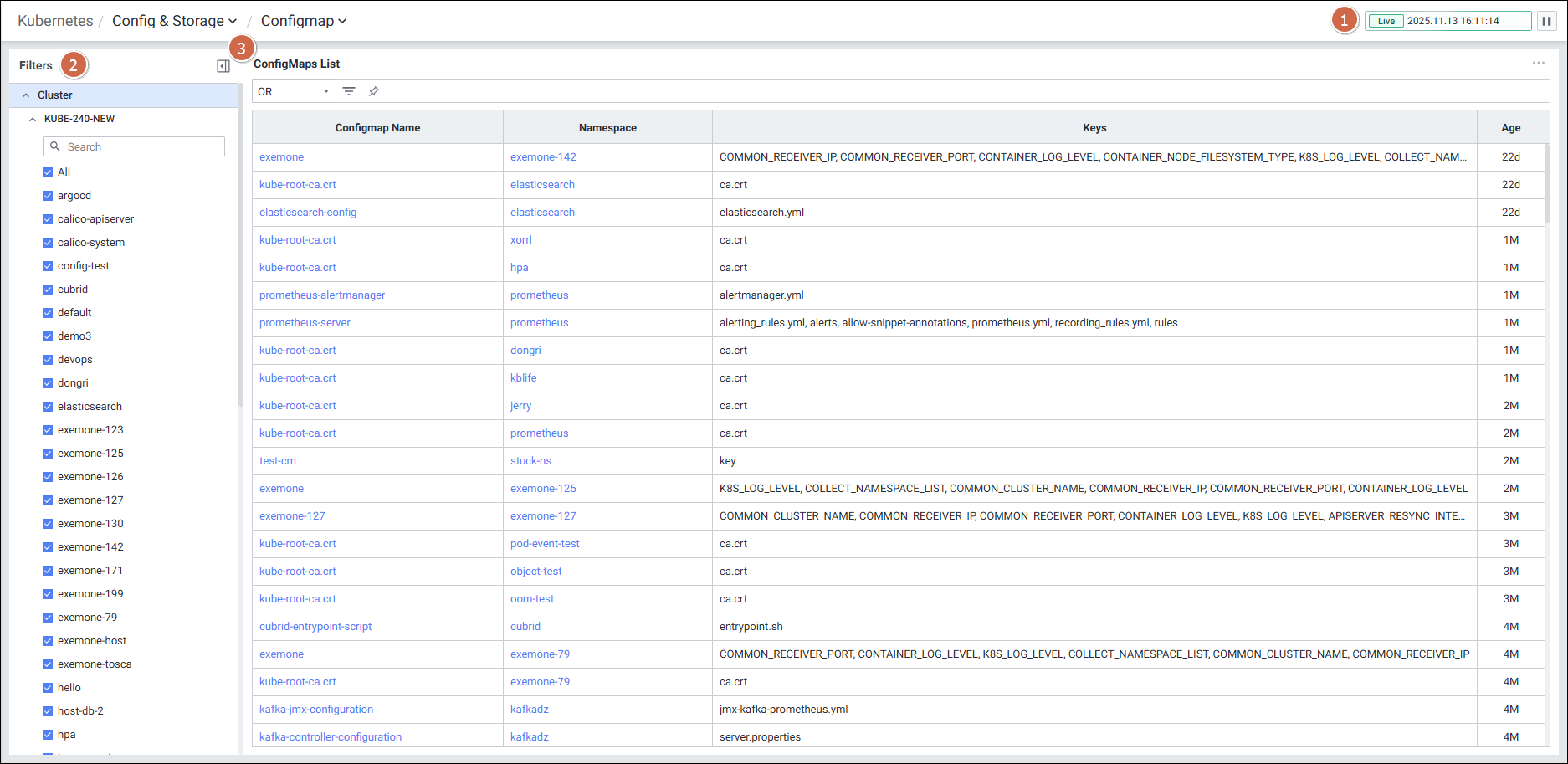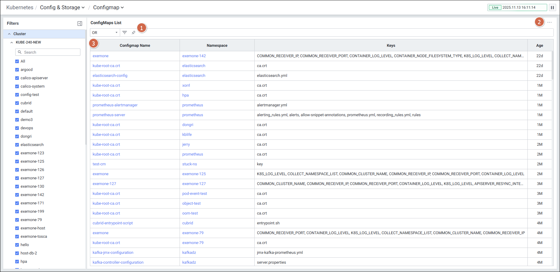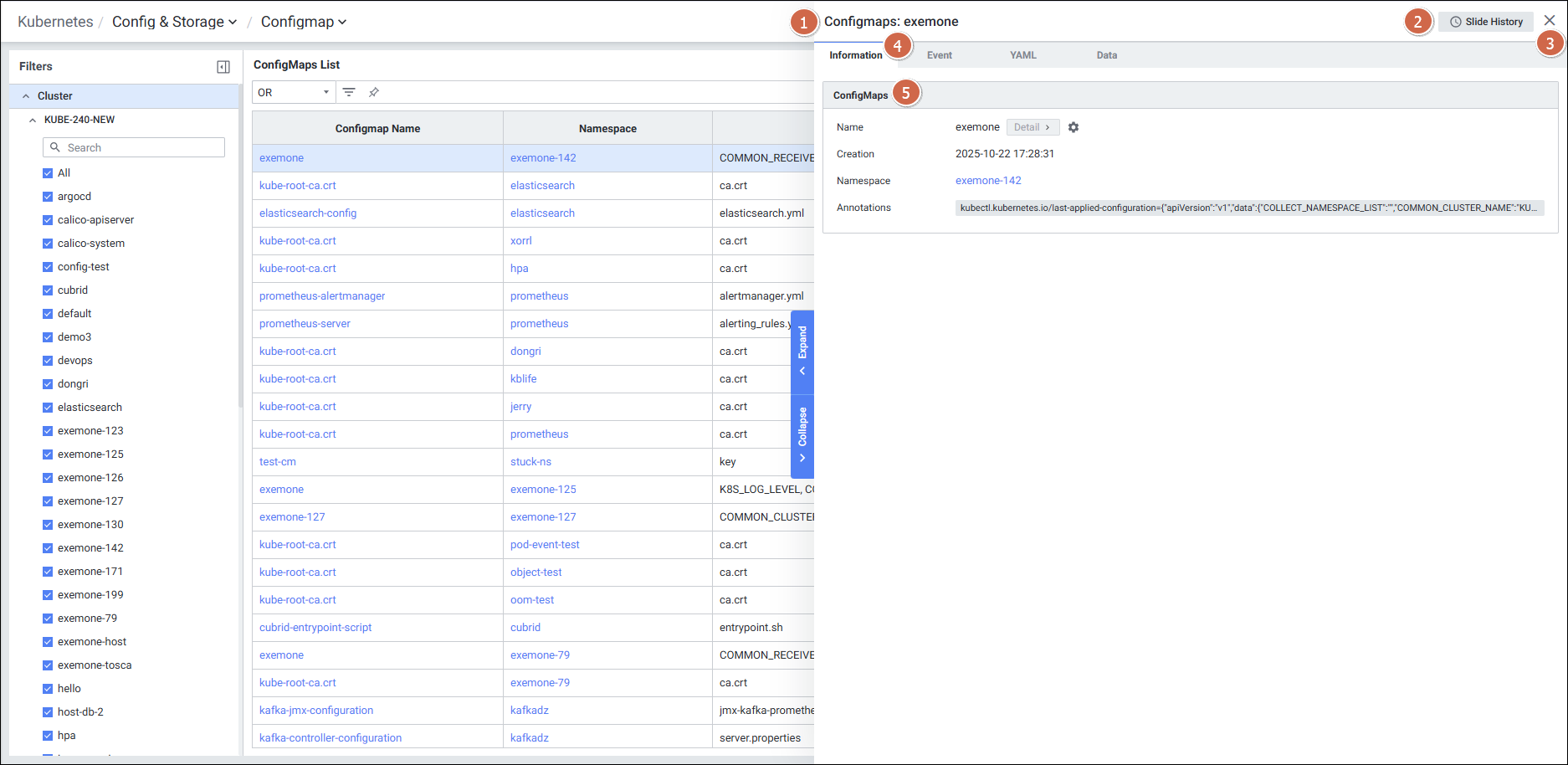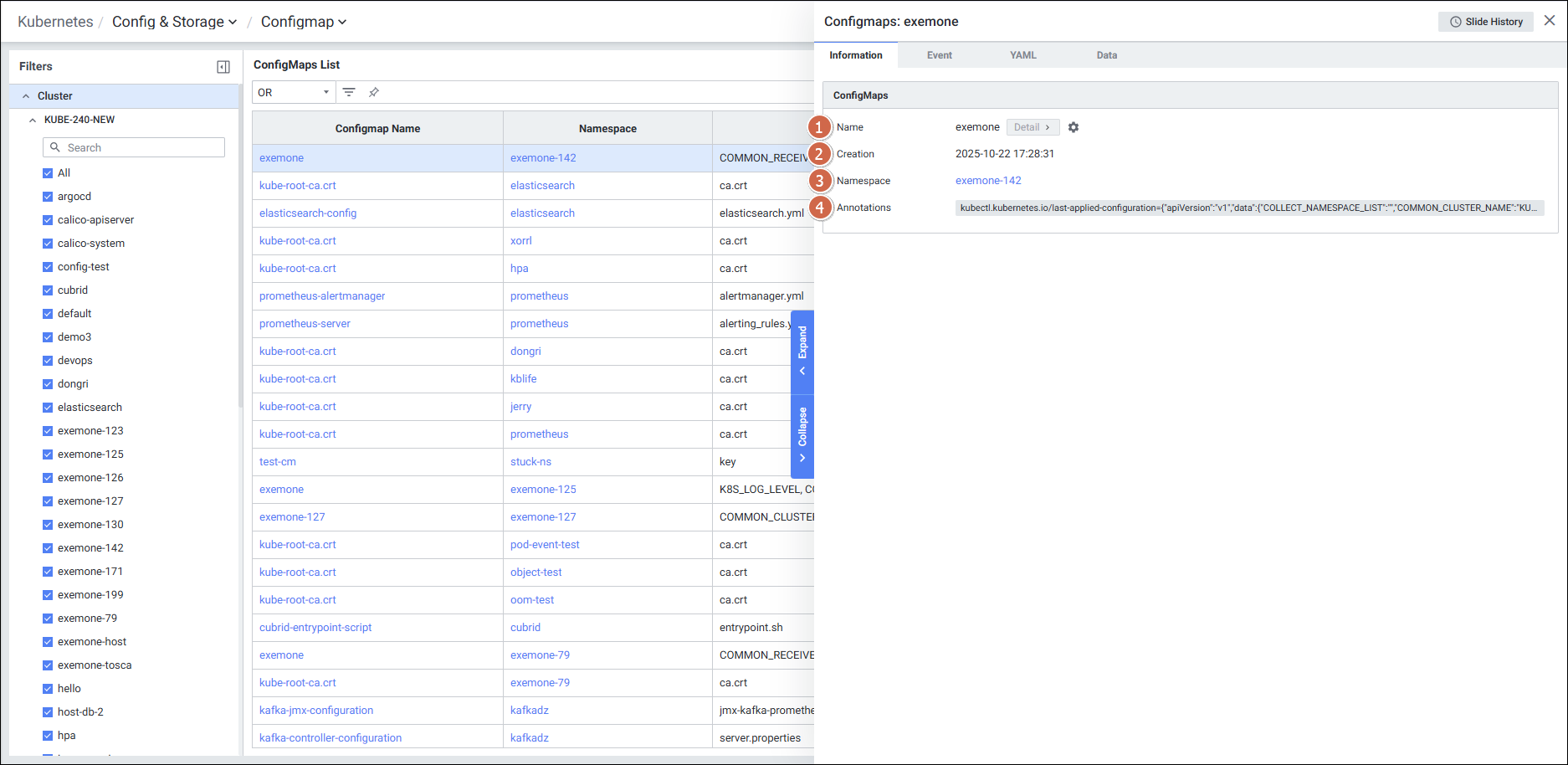 | 2 | Filters | Configmap 화면의 필터 항목을 선택합니다. |