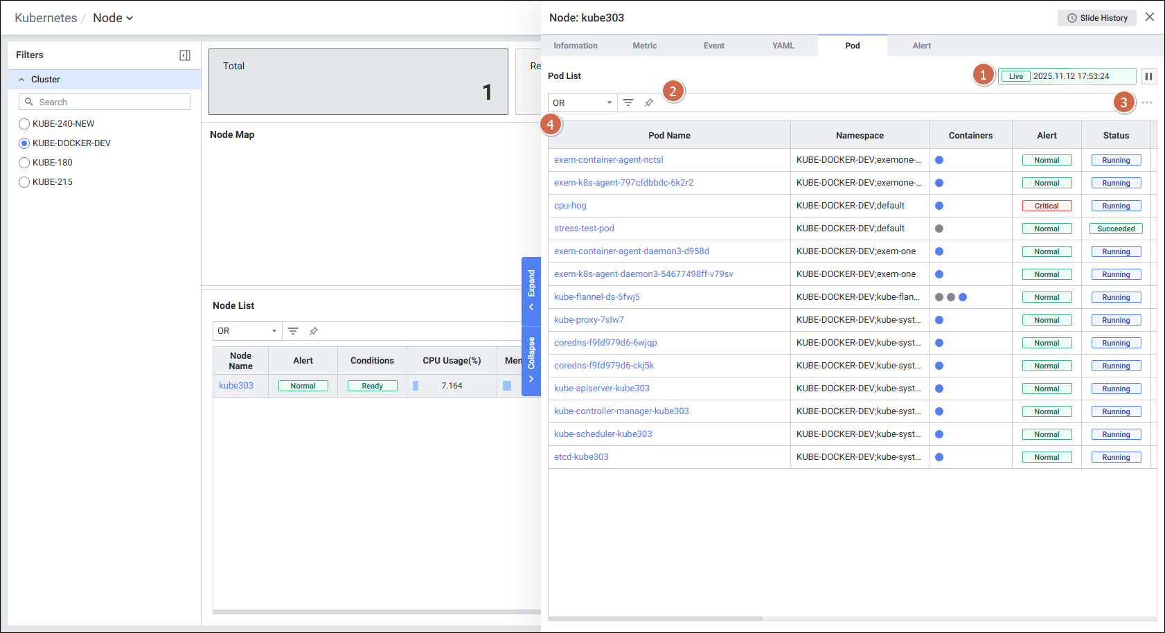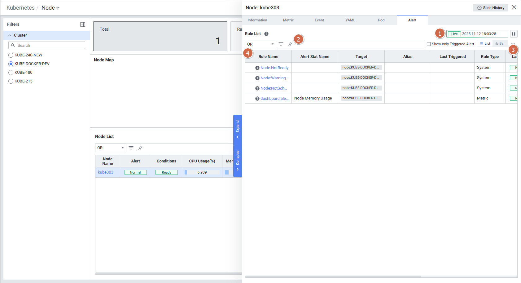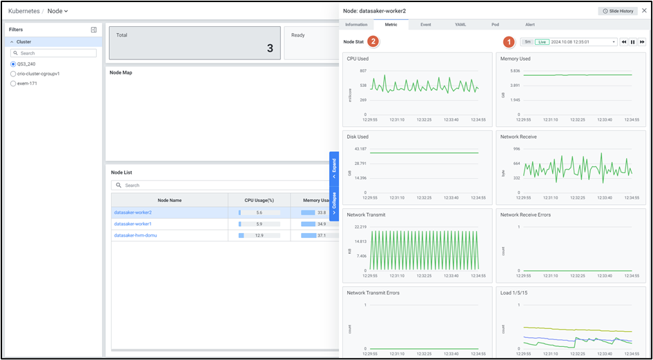 - Node List에서 각 노드의 CPU/Memory/Disk 사용률 등 핵심 지표를 Grid 형태로 확인합니다.