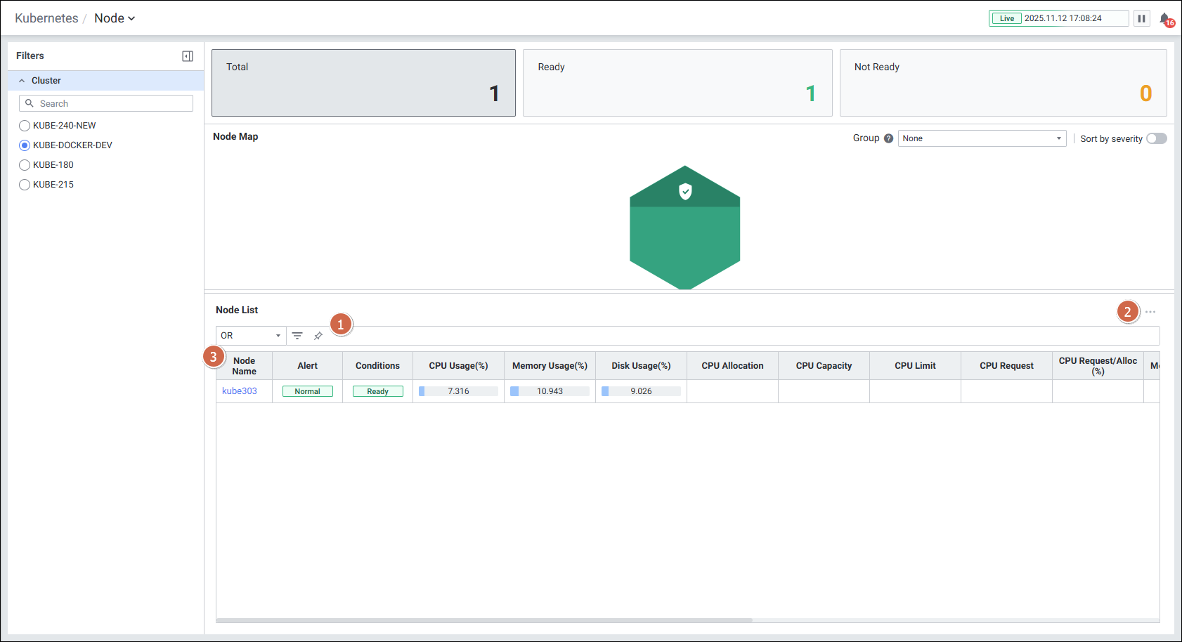 | Not Ready | Not Ready 상태의 노드 개수를 보여줍니다. 클릭 시 Node Map과 노드 목록에서 Not Ready 상태인 노드를 보여줍니다. |