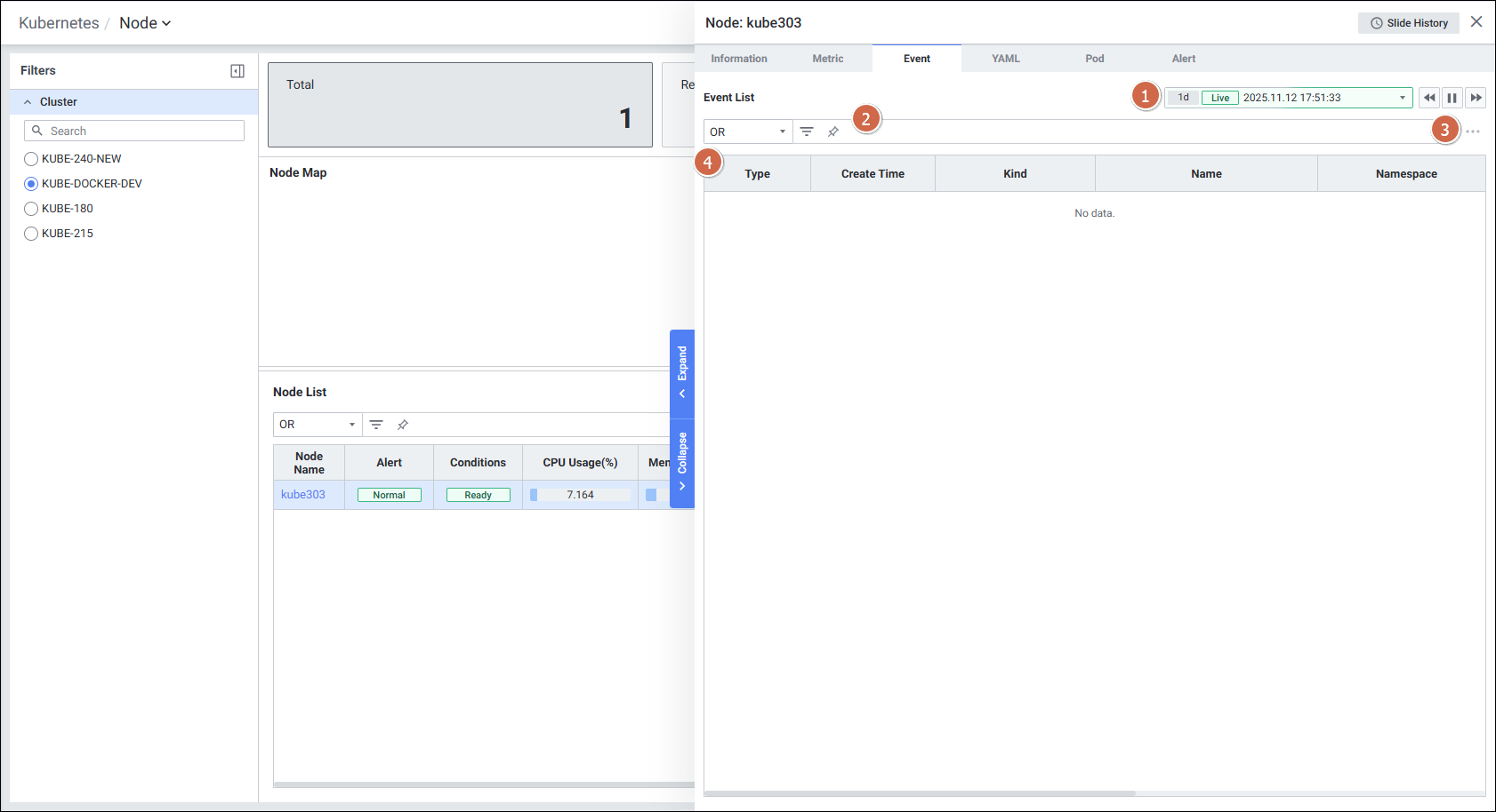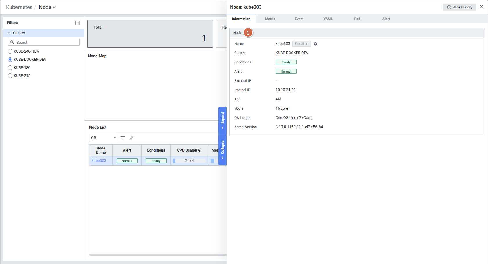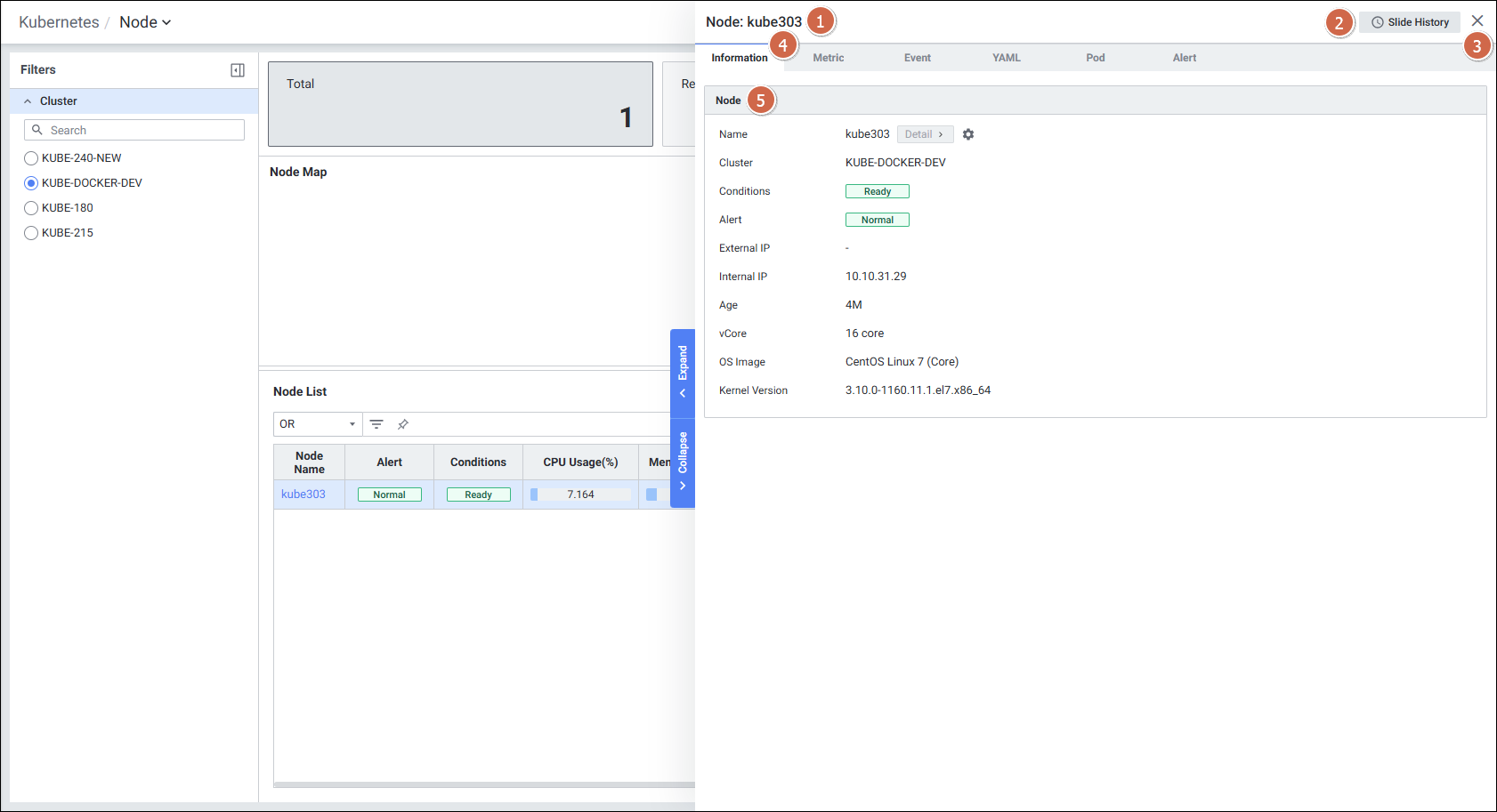 - 특정 노드를 클릭하면 Node Detail Slide가 열리며, 6개 탭(Information, Metric, Event, YAML, Pod, Alert)을 통해 상세 모니터링이 가능합니다.