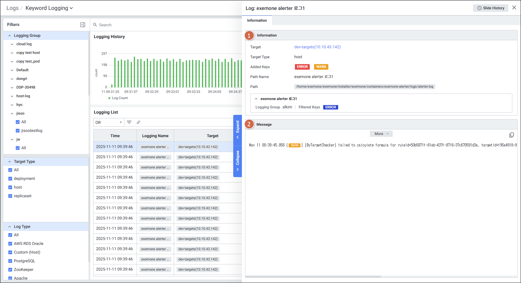 | 4 | Logging List | Keyword에 해당하는 로그 정보를 출력합니다. Log 컬럼 데이터 클릭 시 로그 메시지 상세 화면이 출력됩니다. |