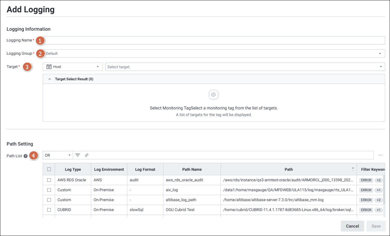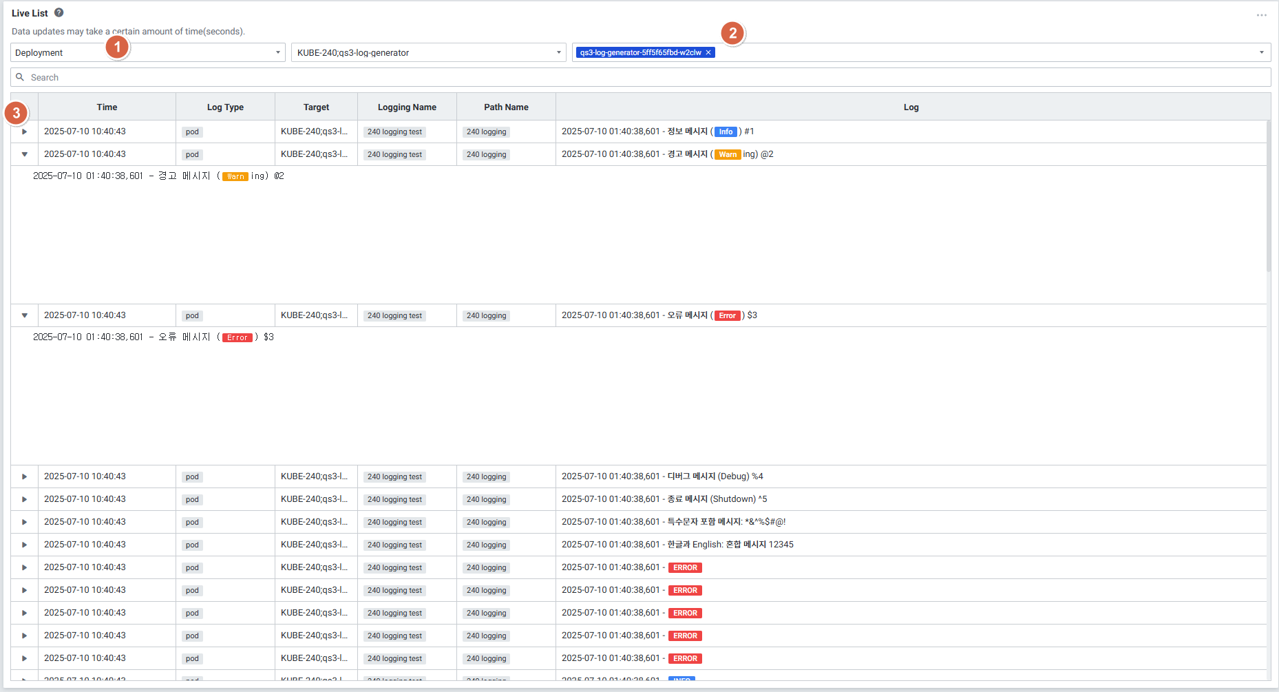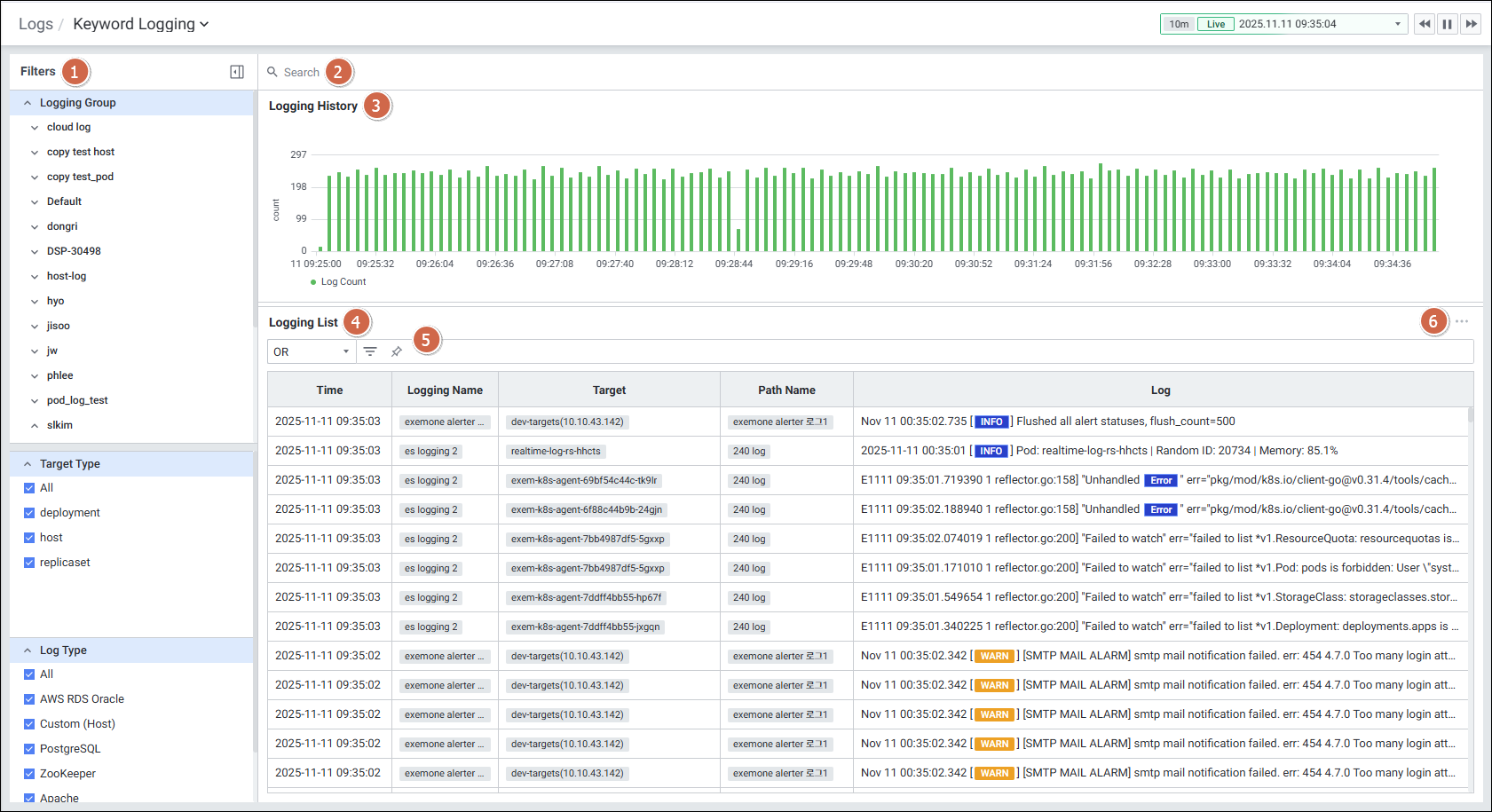 | 1 | Filters | Log Type, Target을 조건으로 조회합니다. Log Type 선택 시 해당 Logging Type에 등록된 Log Target 목록이 표시됩니다. |