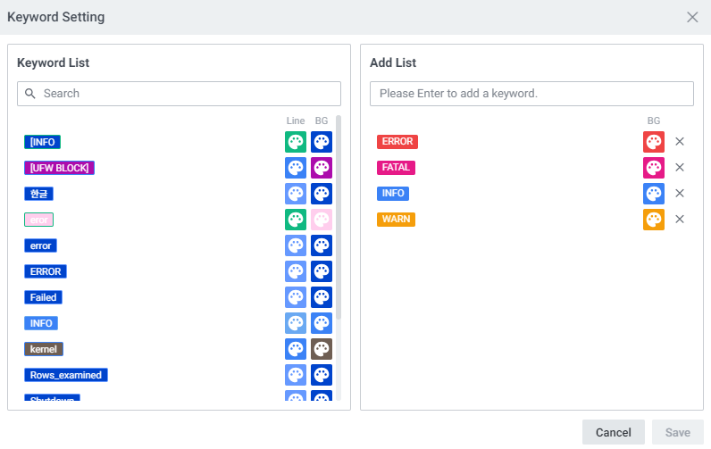 설정한 Keyword가 포함된 로그만 필터링하여 출력하는 기능입니다.