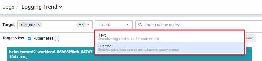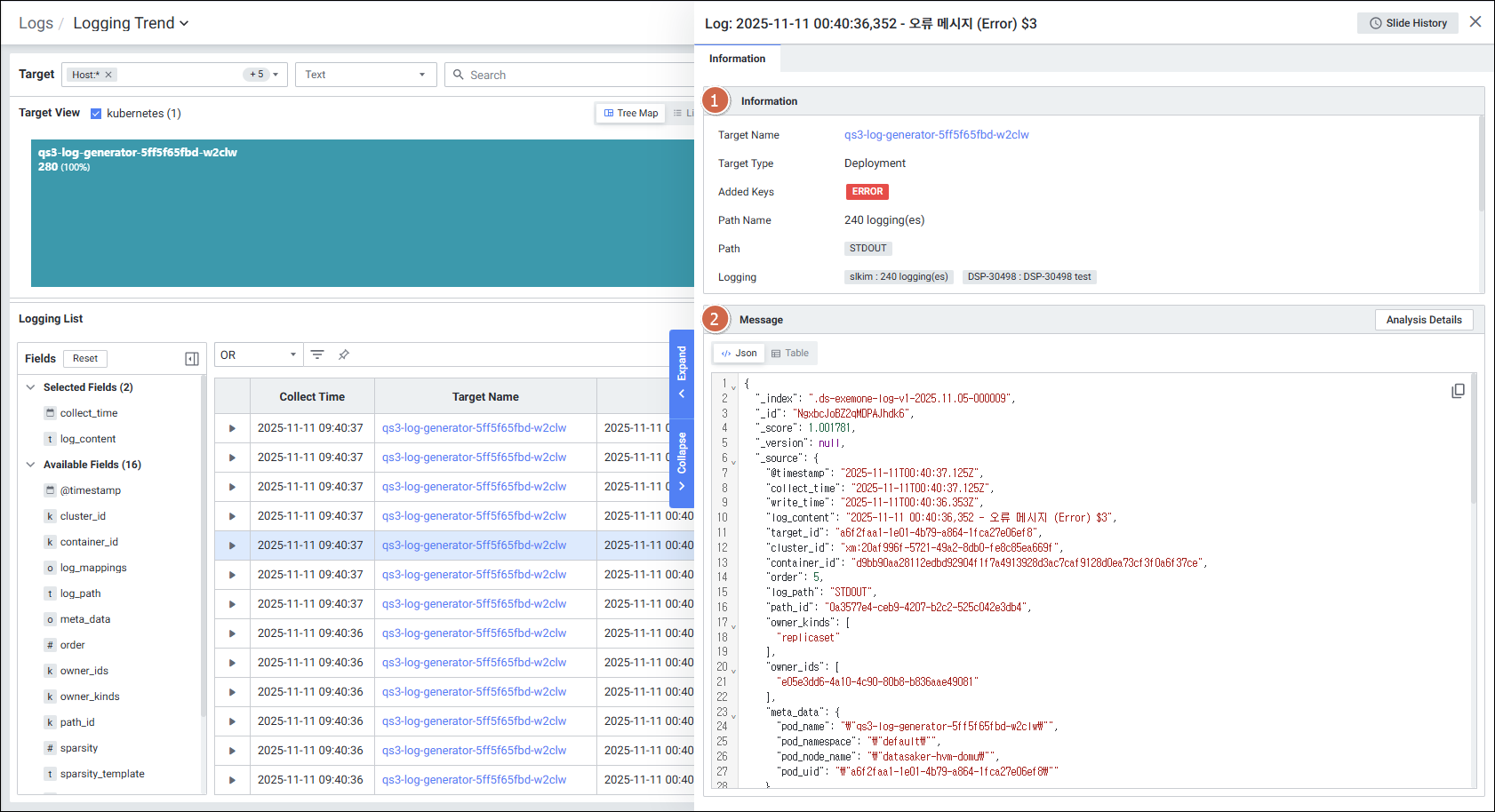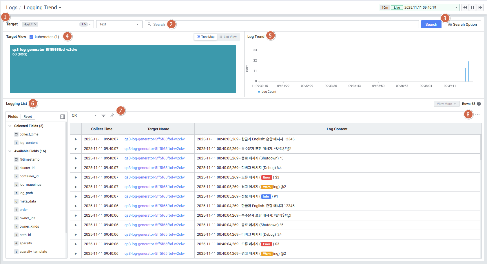 - 검색 결과는 Target View, Log Trend, Logging List 데이터에 모두 반영됩니다.
