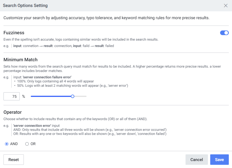 | 3 | Search Option | 검색 정확도, 오타 허용, 키워드 포함 기준 등 검색 결과를 조정할 수 있습니다. |