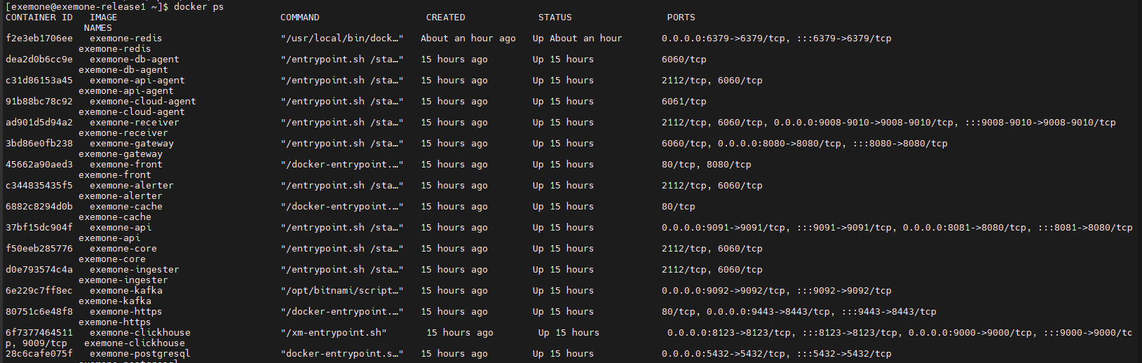 • Docker: docker ps 명령어로 16개 모듈이 모두 Up 상태인지 확인