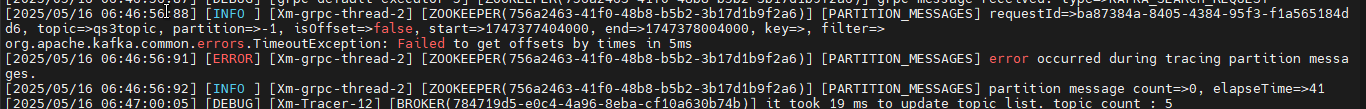 [PARTITION_MESSAGES] requestId=>..., topic=>..., partition=>...— 사용자 요청 정보[PARTITION_MESSAGES] fetching current offset info...— metadata(offset) 조회 시작[PARTITION_MESSAGES] metadata completed.— metadata(offset) 조회 완료[PARTITION_MESSAGES] converting timestamps to offsets...— timestamp → offset 변환 시작[PARTITION_MESSAGES] timestamp conversion completed.— 변환 완료[PARTITION_MESSAGES] TopicPartition=>..., fromOffset=>..., toOffset=>...— 실제 조회 범위[PARTITION_MESSAGES] seek completed.— consumer 준비 완료[PARTITION_MESSAGES] fetched ... records.— poll 레코드 수[PARTITION_MESSAGES] reached toOffset, breaking loop— 목표 offset 도달[PARTITION_MESSAGES] partition [...] completed. ... records in queue.— partition 처리 완료[PARTITION_MESSAGES] partition message count=>..., elapseTime=>...— 총 수집 메시지 및 소요 시간