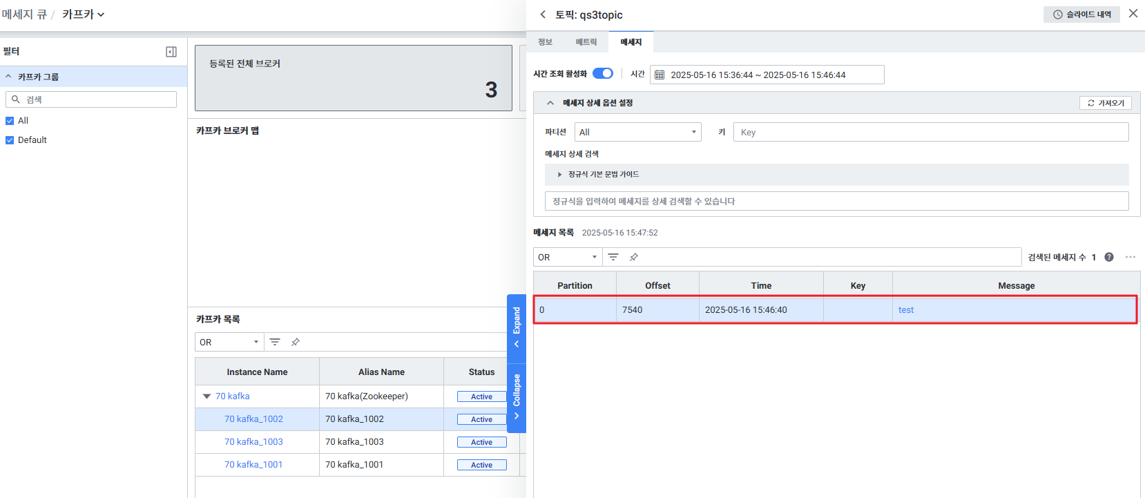 설치 및 등록 완료 후, exemONE 웹 화면의 Message Queue > Kafka 메뉴에서 모니터링할 수 있습니다.