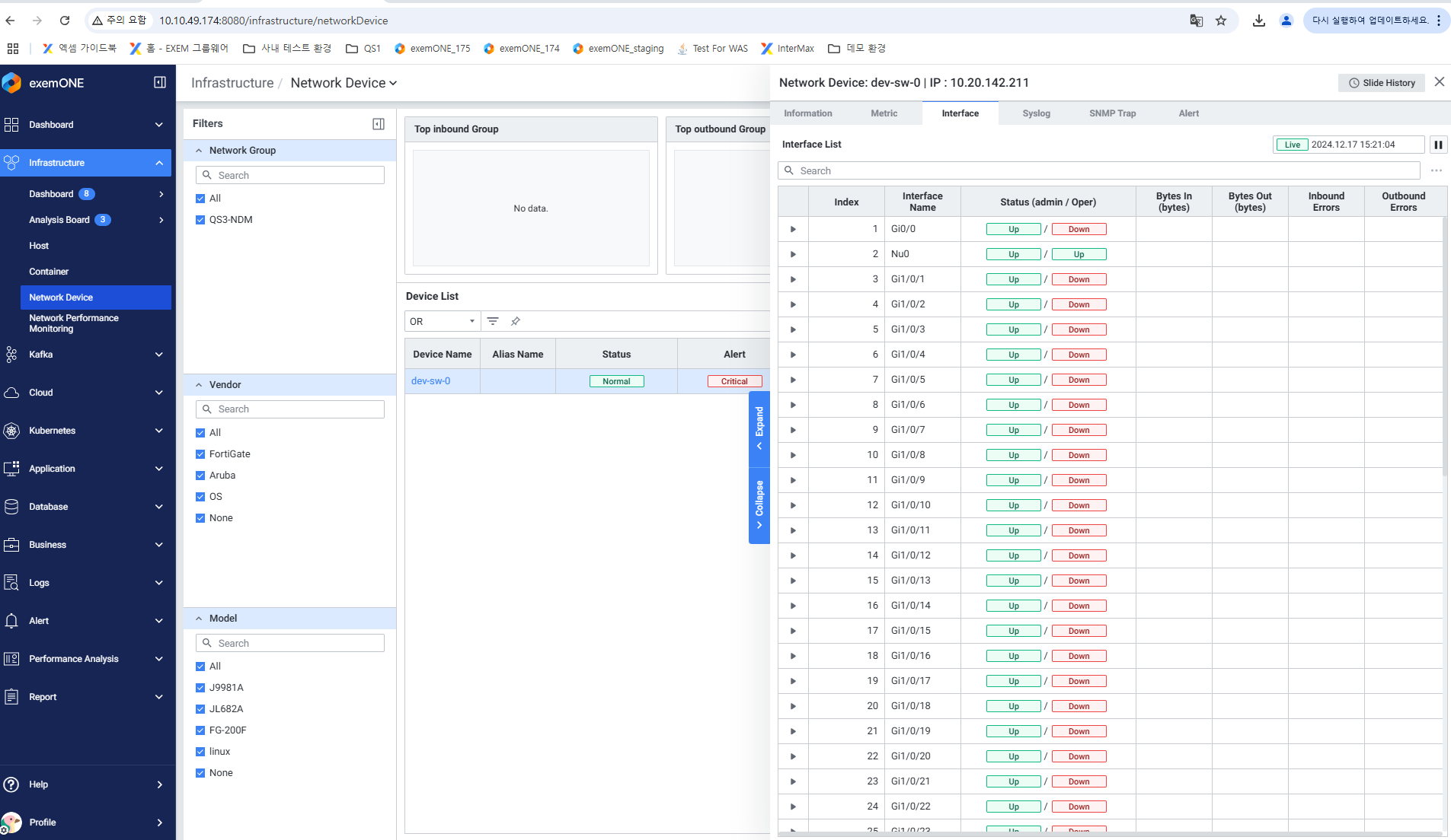 - Infrastructure > Network Device 메뉴에서 연결된 네트워크 디바이스 상태를 확인합니다.