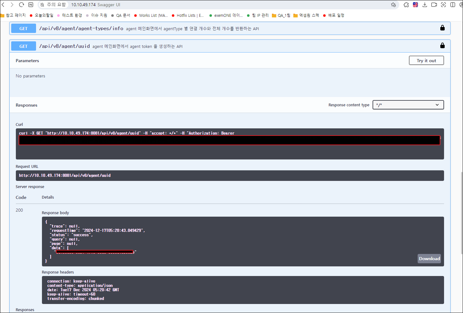 - 수집서버의 8081 포트로 접속 → Swagger에서 APIkey 인증 → Agent UUID 확인